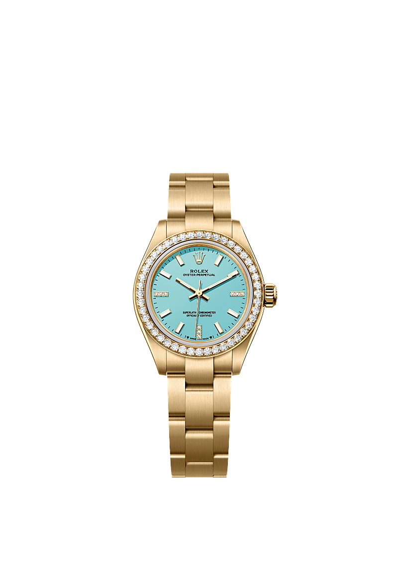 The Oyster Perpetual 28 in 18 ct yellow gold with a turquoise blue, diamond-set dial and an Oyster bracelet.