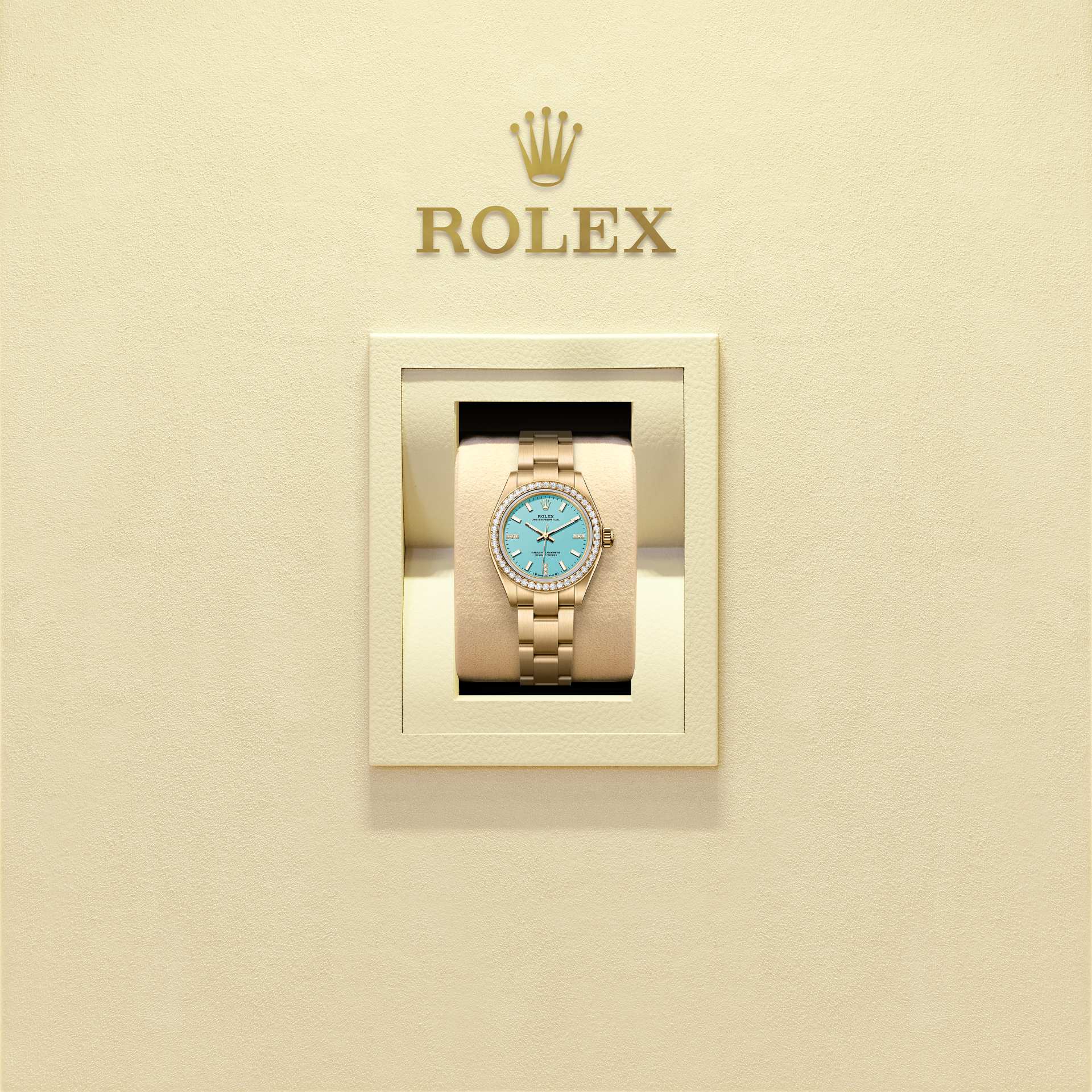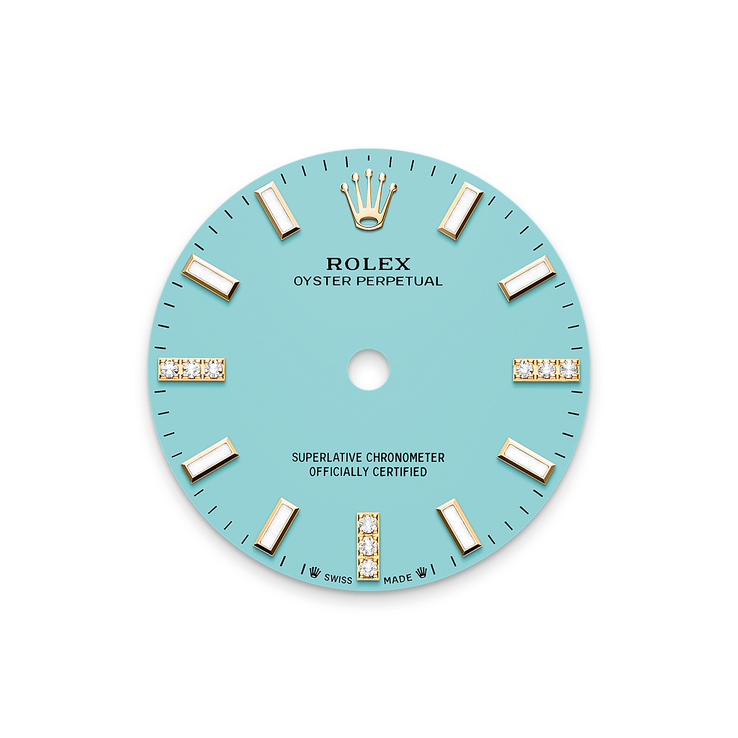 This dial features hour markers in 18 ct gold at 3, 6 and 9 o’clock, set with 9 diamonds. The colours created for the Oyster Perpetual range start life as a lacquer, which must be meticulously applied in a controlled-atmosphere environment to avoid dust and other contamination.