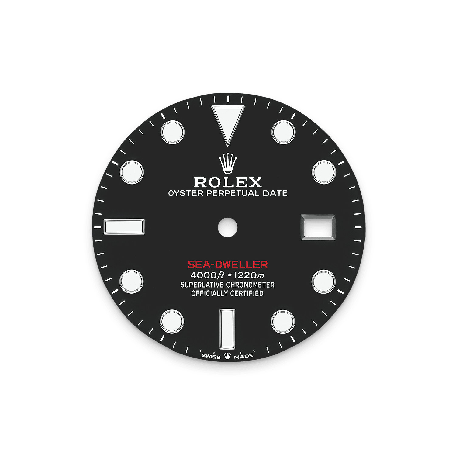 The black dial of the Sea-Dweller has the large hands and indices reserved for Rolex professional models. The dial bears the name Sea-Dweller in red, a reference to the first model.