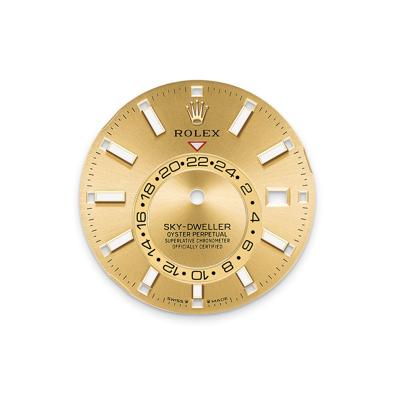 The Oyster Perpetual Sky-Dweller in 18 ct yellow gold with a champagne-colour dial and an Oysterflex bracelet.