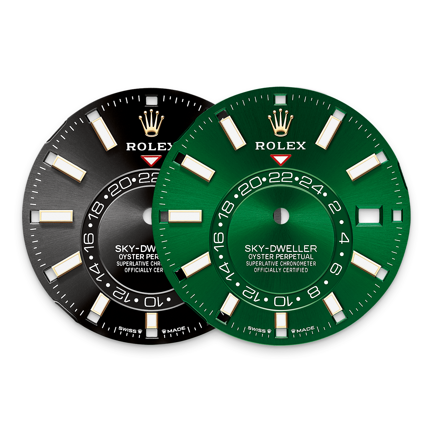 It was therefore identical to the fluting on the case back, which was also screwed onto the case for waterproofness, using specific Rolex tools. Over time, the fluting became an aesthetic element, a genuine Rolex signature feature. Today the fluted bezel is a mark of distinction, always in gold. The Sky-Dweller is equipped with a mechanism of interaction between the rotatable bezel, the winding crown and the movement: the Ring Command system, which allows the user to select the watch's functions one-by-one and to set them easily, quickly and securely.
