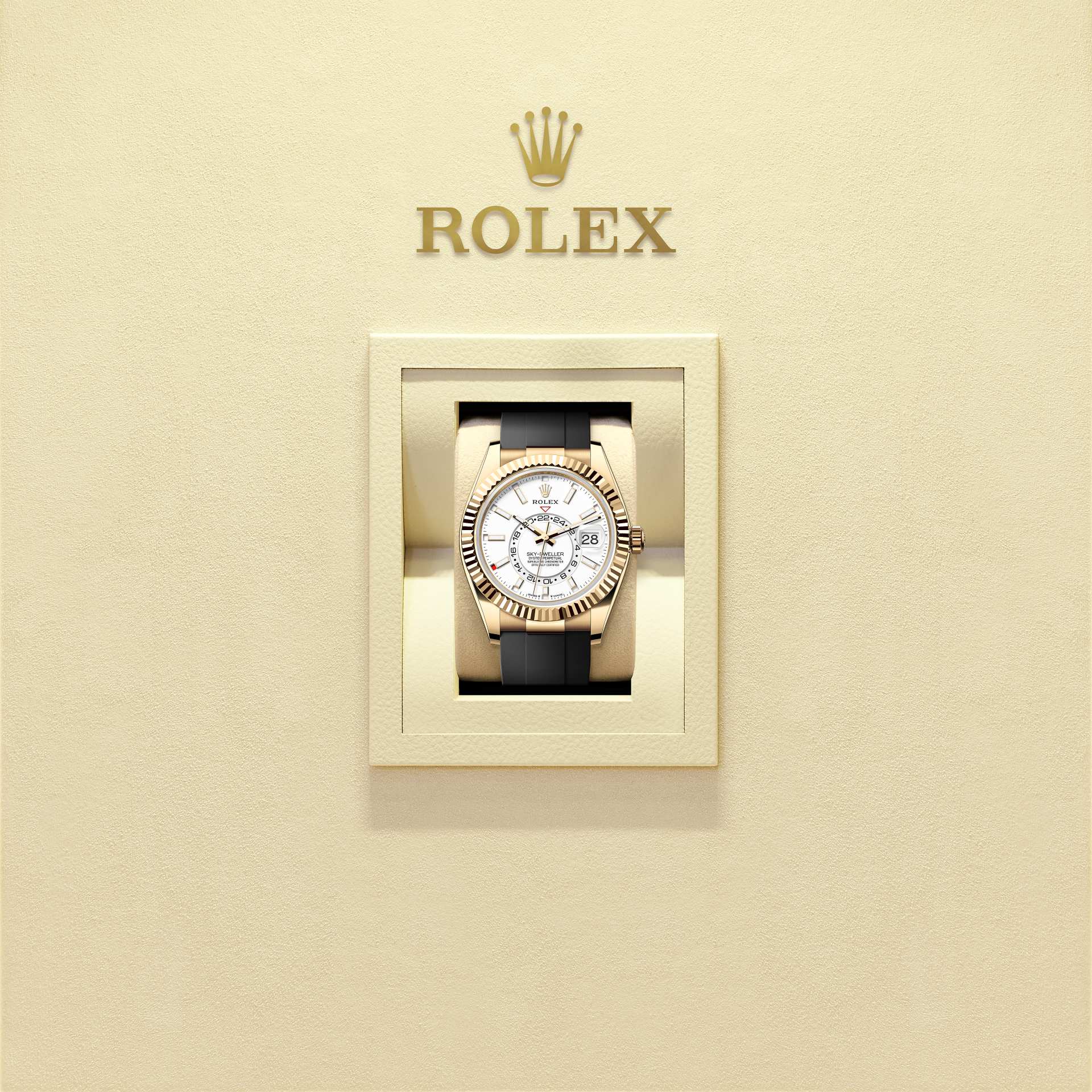 The Oyster Perpetual Sky-Dweller in 18 ct yellow gold with an intense white dial and an Oysterflex bracelet.