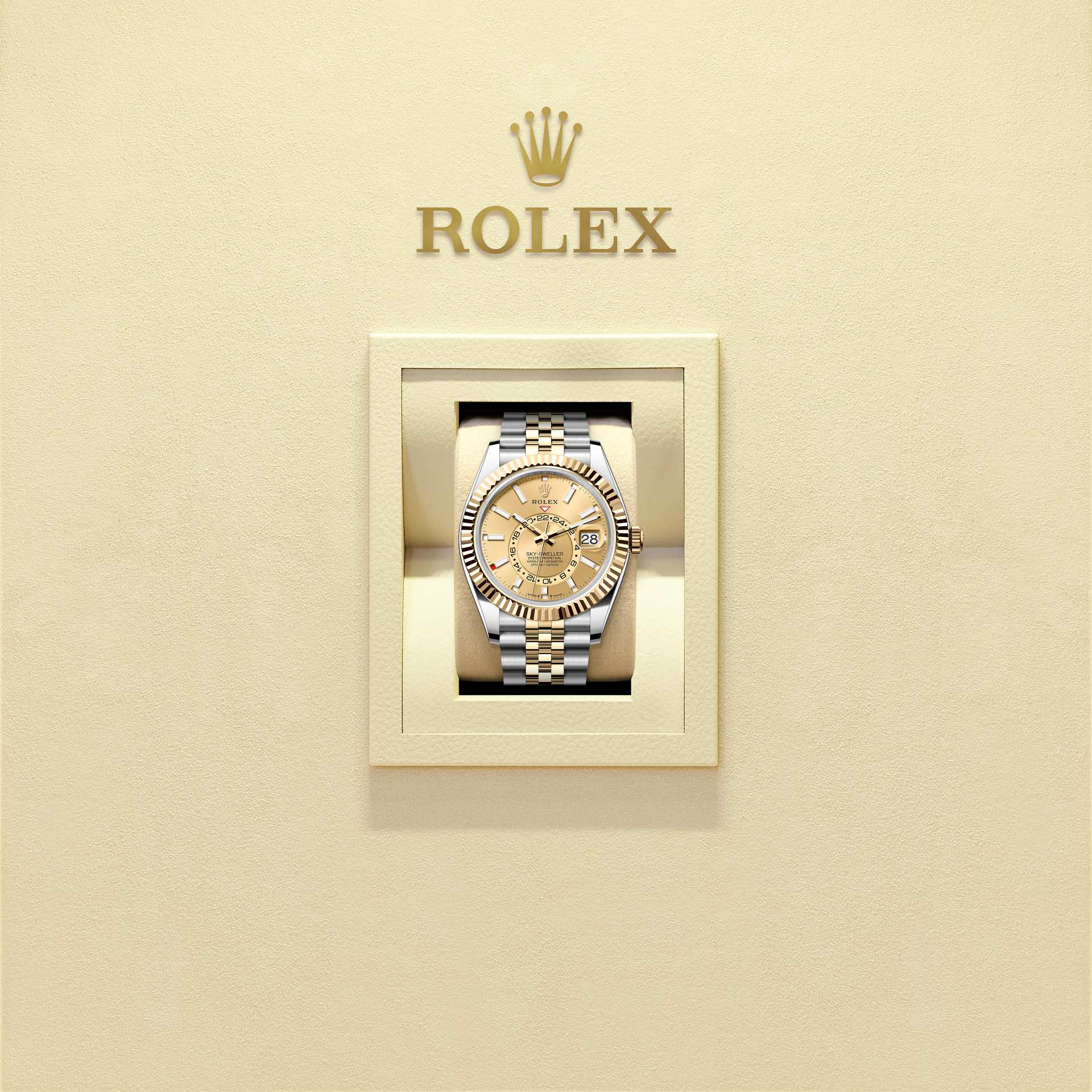 The Oyster Perpetual Sky-Dweller in Oystersteel and yellow gold with a champagne-colour dial and a Jubilee bracelet.