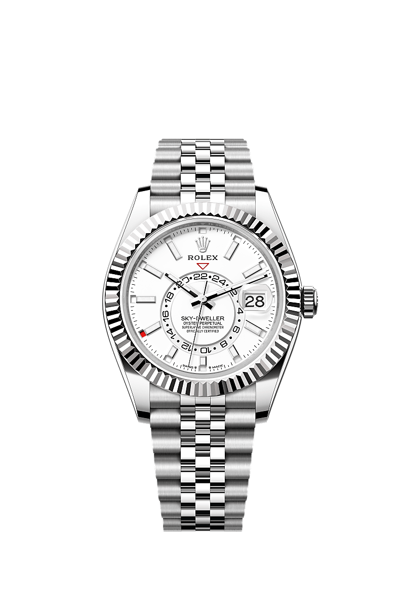 The Oyster Perpetual Sky-Dweller in Oystersteel and white gold with an intense white dial and a Jubilee bracelet.