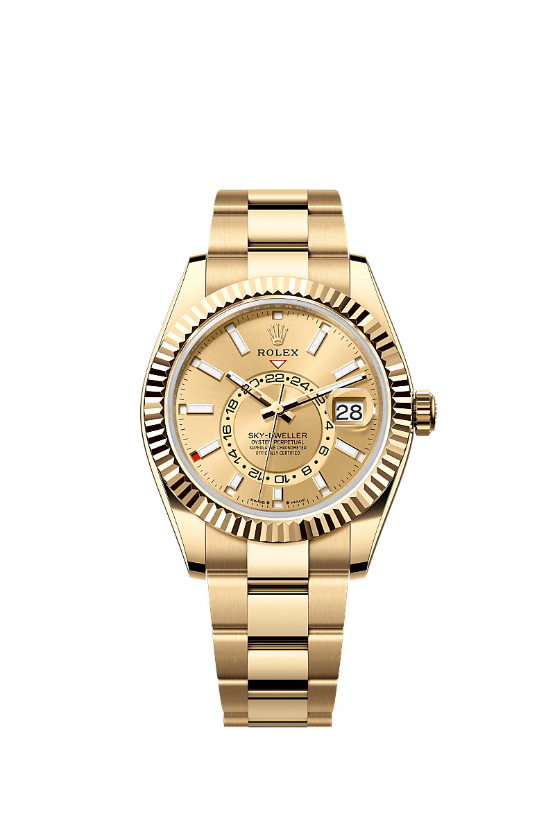 The Oyster Perpetual Sky-Dweller in 18 ct yellow gold with a champagne-colour dial and an Oyster bracelet.