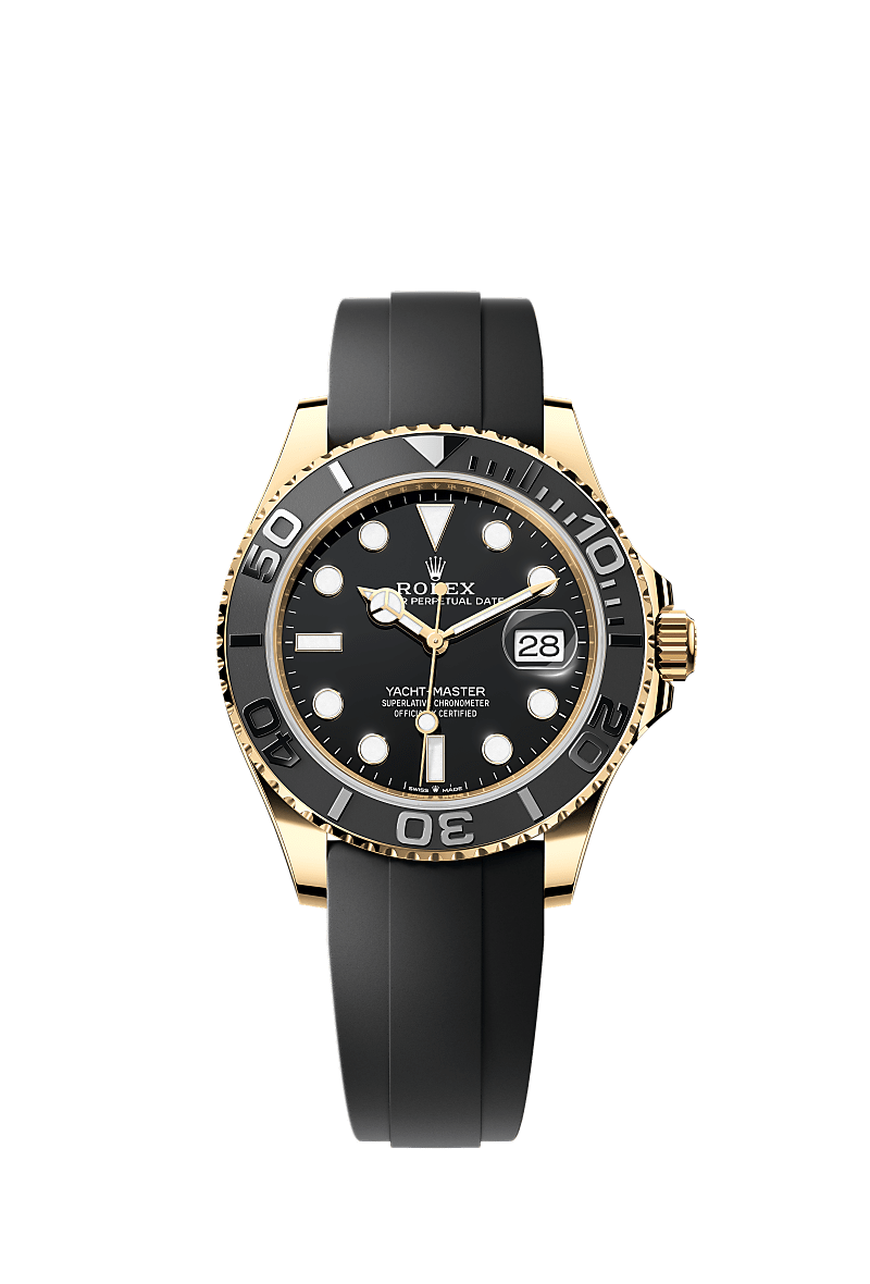 The Oyster Perpetual Yacht-Master 42 in 18 ct yellow gold with a black dial and an Oysterflex bracelet.