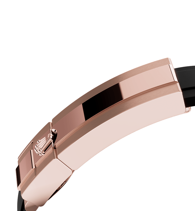 The blade is overmoulded with high-performance black elastomer which is particularly resistant to environmental effects, very durable and perfectly inert for the wearer of the watch. For enhanced comfort, the inside of the Oysterflex bracelet is equipped with a patented longitudinal cushion system that stabilizes the watch on the wrist and fitted with an 18 ct Everose gold Oysterlock safety clasp. It also features the Rolex Glidelock extension system, designed by the brand and patented. This inventive toothed mechanism, integrated beneath the clasp, allows fine adjustment of the bracelet length by some 15 mm in increments of approximately 2.5 mm, without the use of tools.