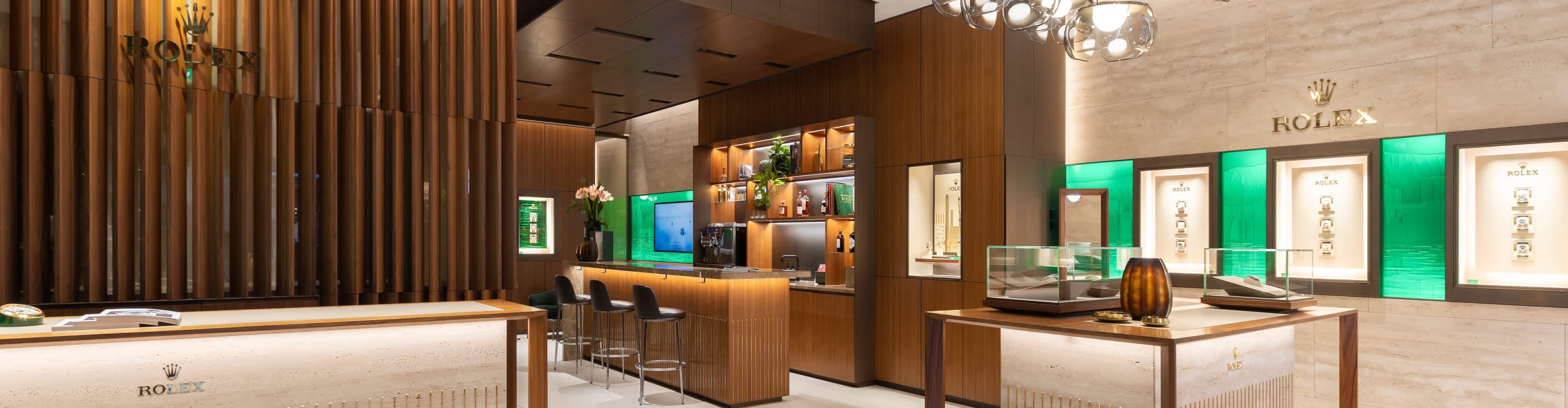 我们的专卖店均按照劳力士日内瓦所制定的室内设计概念进行装潢摆设,象征品牌与ROLEX BOUTIQUE