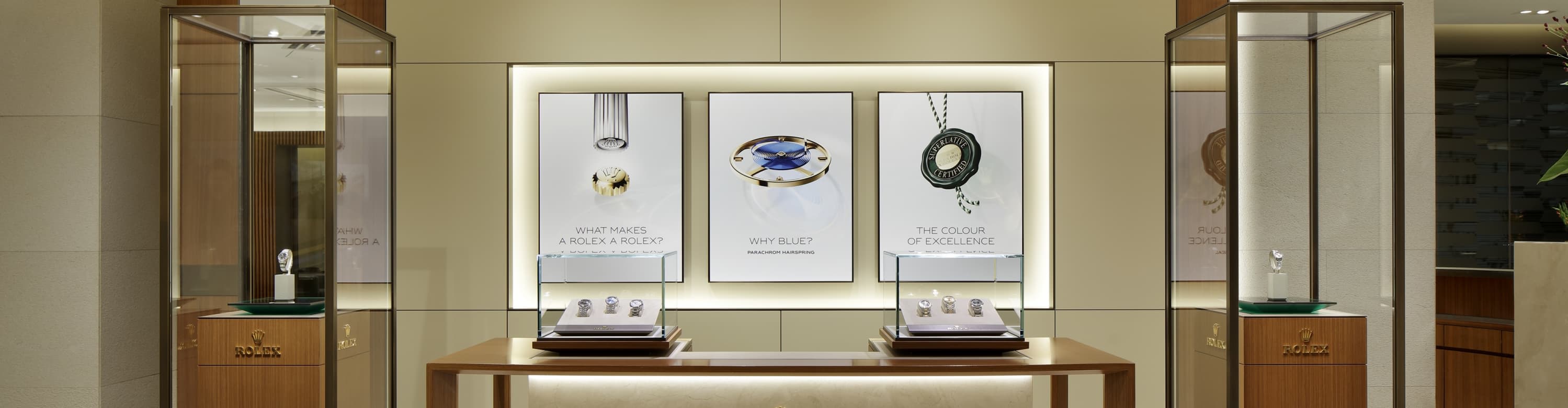 我们的专卖店均按照劳力士日内瓦所制定的室内设计概念进行装潢摆设,象征品牌与ROLEX BOUTIQUE