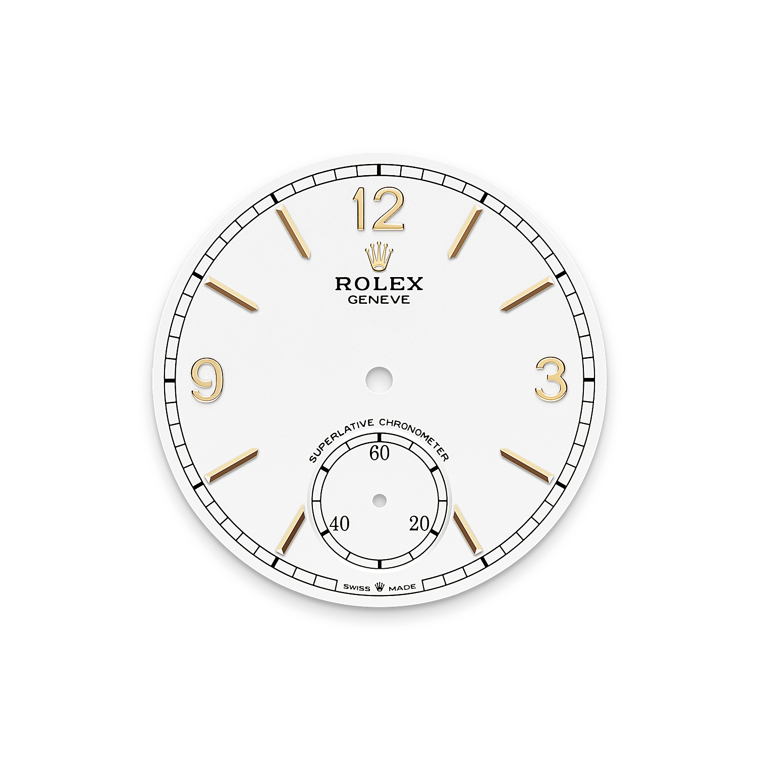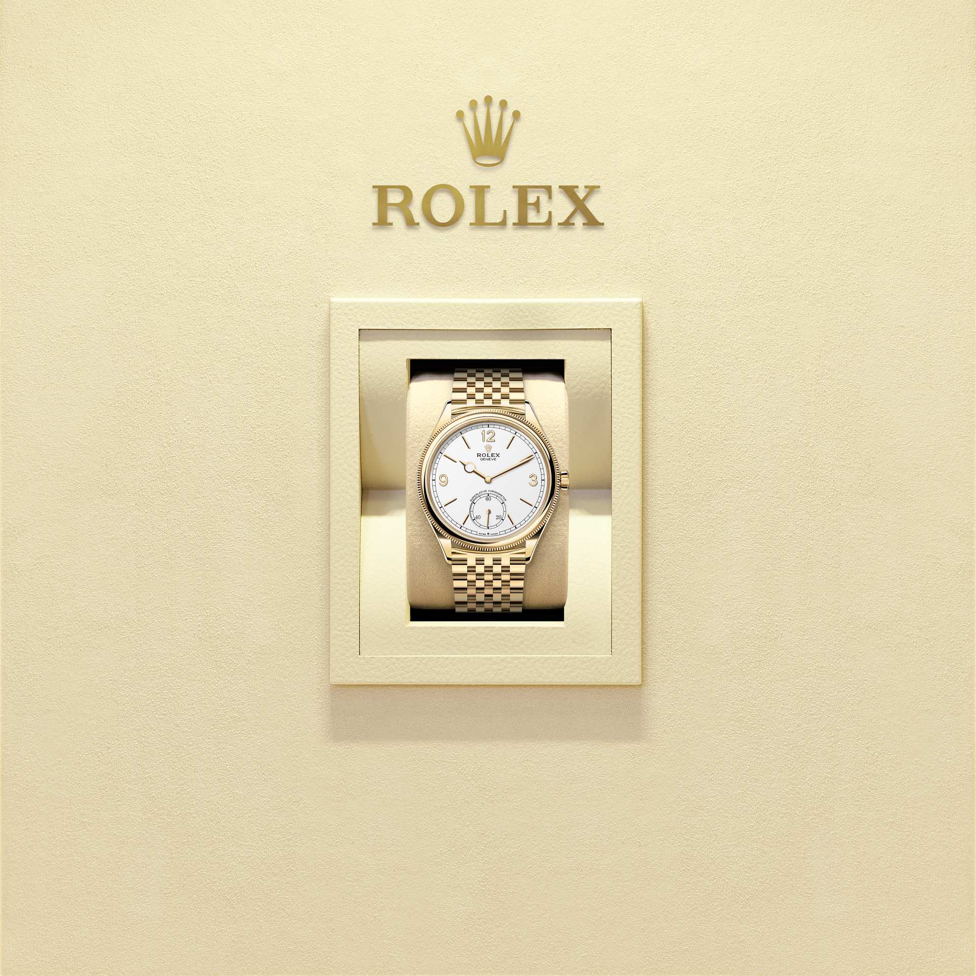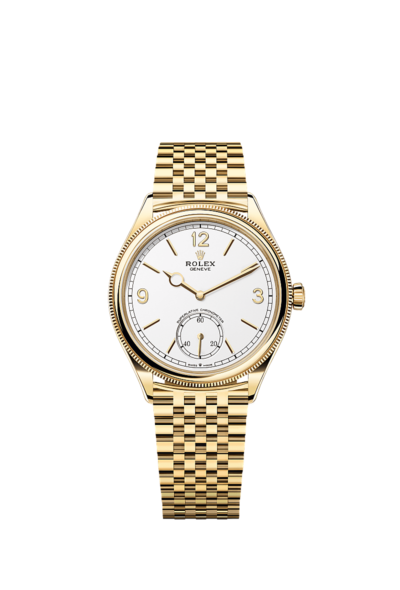 恒动1908型腕表18K黄金款,搭配39毫米表壳、醇白色表盘及劳力士七臻型(Settimo)表带。
