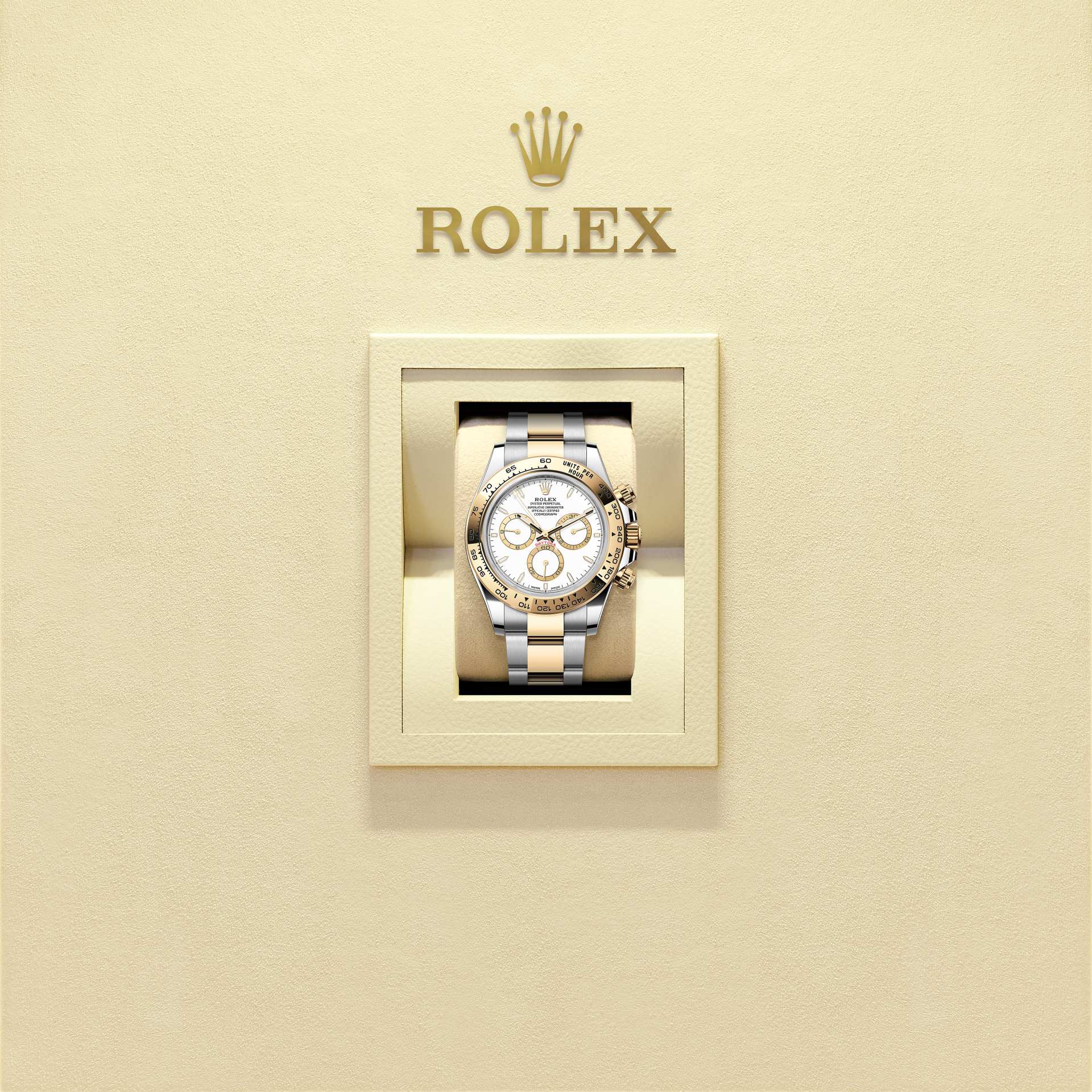 蚝式恒动宇宙计型迪通拿腕表黄金及蚝式钢款,搭配白色表盘及色彩对比鲜明的计时盘。腕表配备蚝式(Oyster)表带,黄金外圈刻有测速计。
