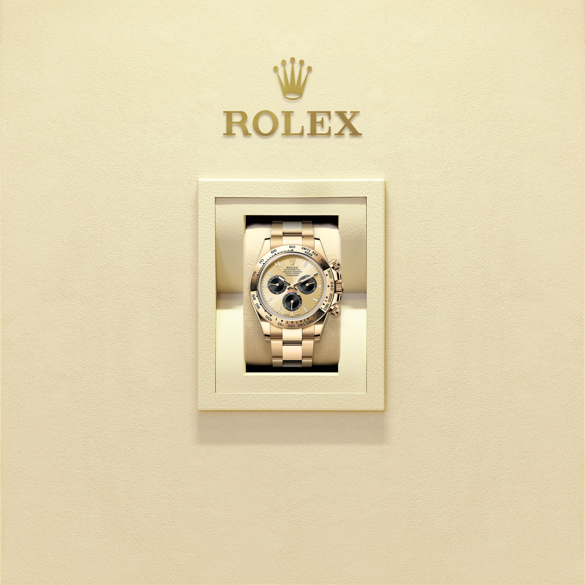 蚝式恒动宇宙计型迪通拿腕表18K黄金款,搭配金色及亮黑色表盘及蚝式(Oyster)表带,18K黄金外圈刻有测速计。