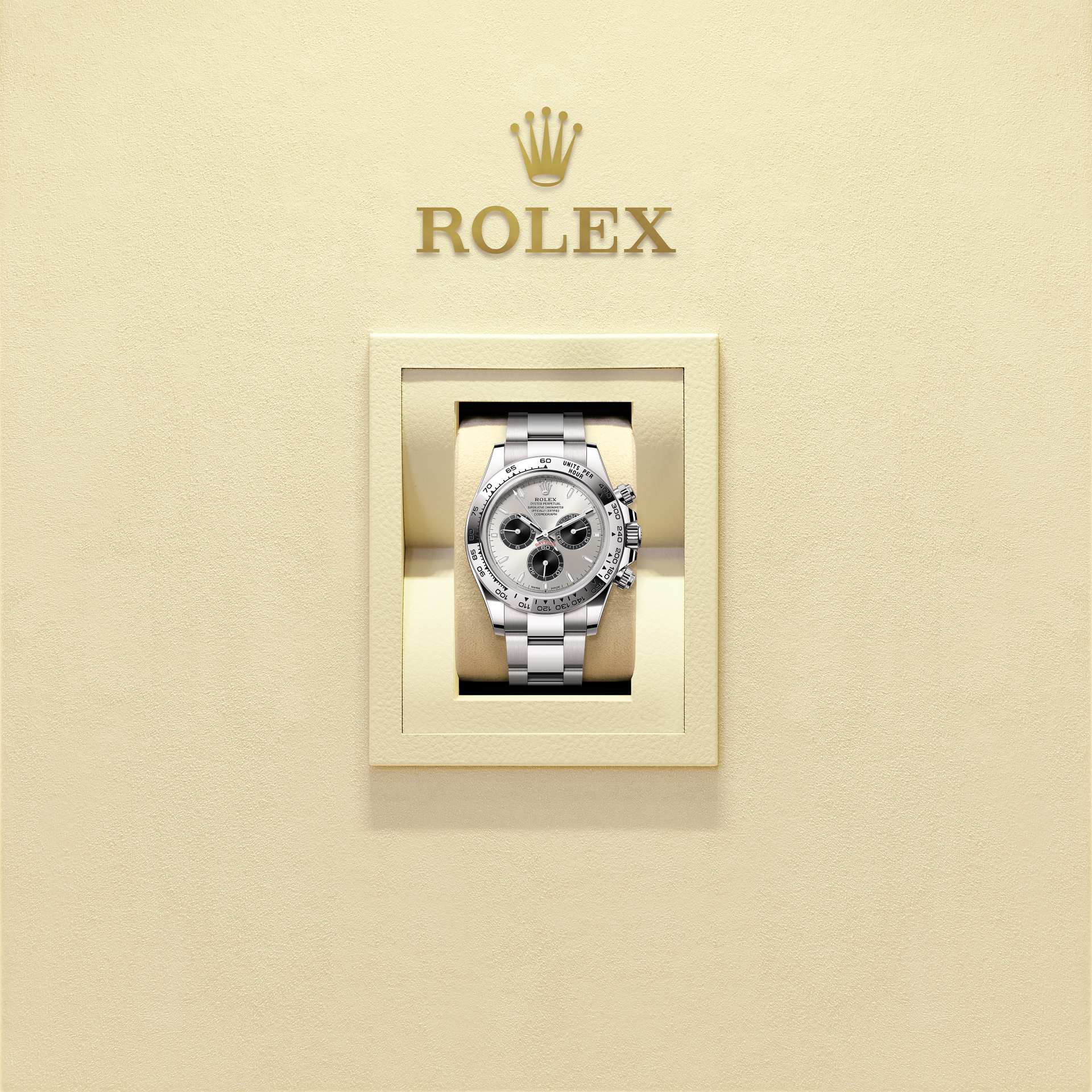 蚝式恒动宇宙计型迪通拿腕表18K白色黄金款,搭配不锈钢色及亮黑色表盘及蚝式(Oyster)表带,18K白色黄金外圈刻有测速计。