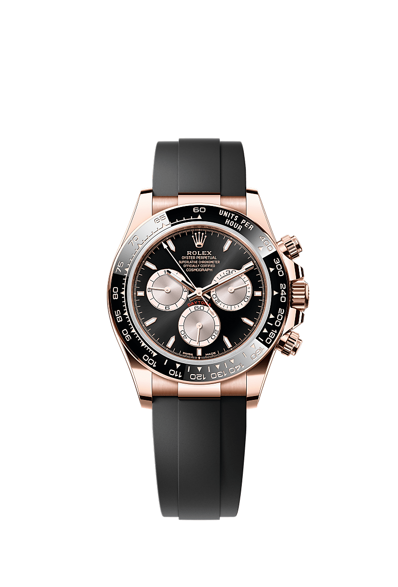 蚝式恒动宇宙计型迪通拿腕表18K永恒玫瑰金款,搭配亮黑色及日亮金色表盘及Oysterflex表带,黑色Cerachrom外圈设测速计。