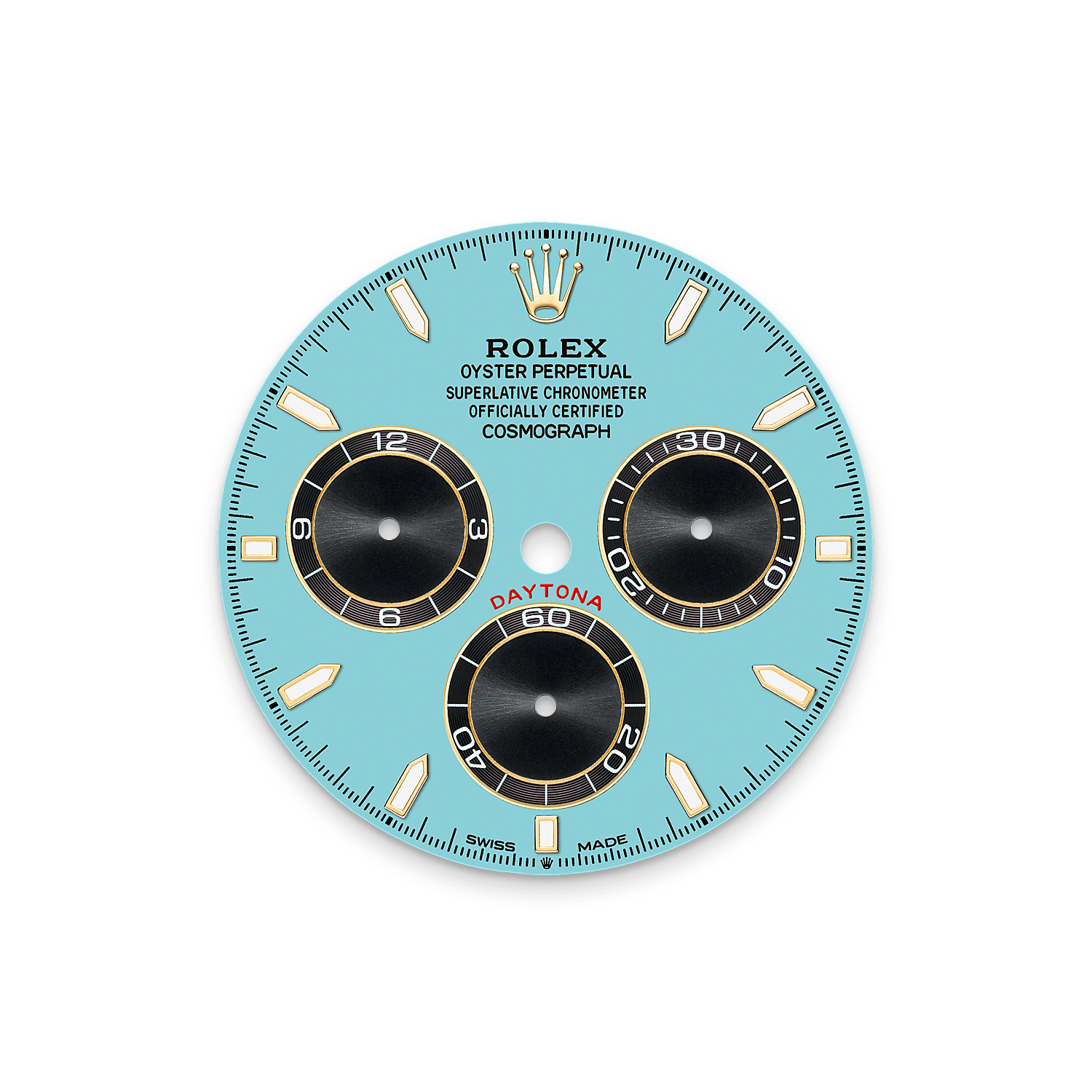 蚝式恒动宇宙计型迪通拿腕表18K黄金款,搭配绿松石蓝色及黑色表盘及Oysterflex表带,黑色Cerachrom外圈设测速计。