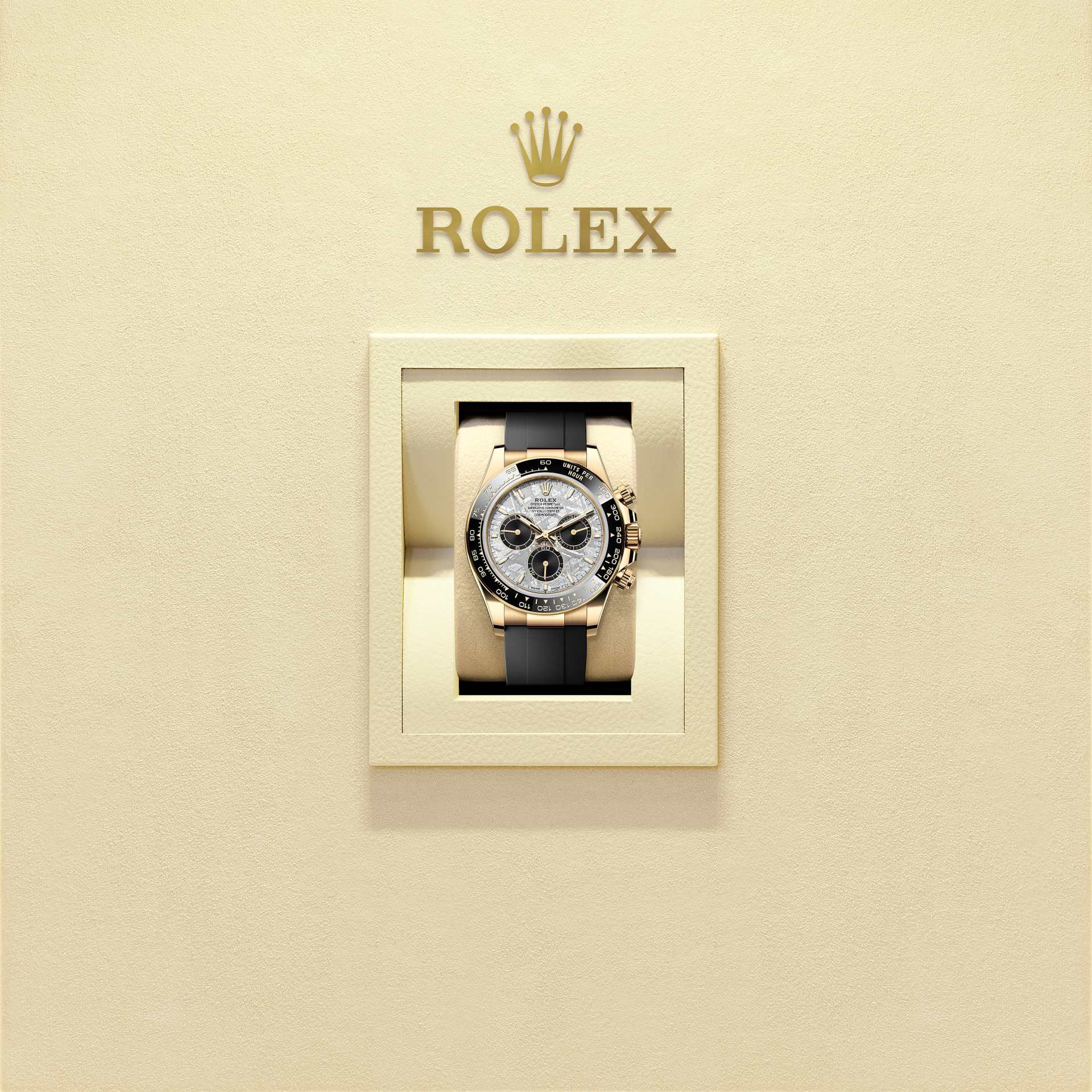 蚝式恒动宇宙计型迪通拿腕表18K黄金款,搭配陨石及黑色表盘及Oysterflex表带,黑色Cerachrom外圈设测速计。