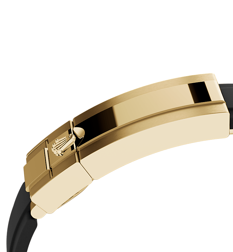 表带内里由两块弧形弹性金属片组成,表带两侧各一片,外层则以高性能黑色橡胶注塑包覆。为确保佩戴更舒适,Oysterflex表带内侧配备缓冲垫,蚝式保险扣则防止表带意外开启。通过Rolex Glidelock延展系统即可调节表带长度。