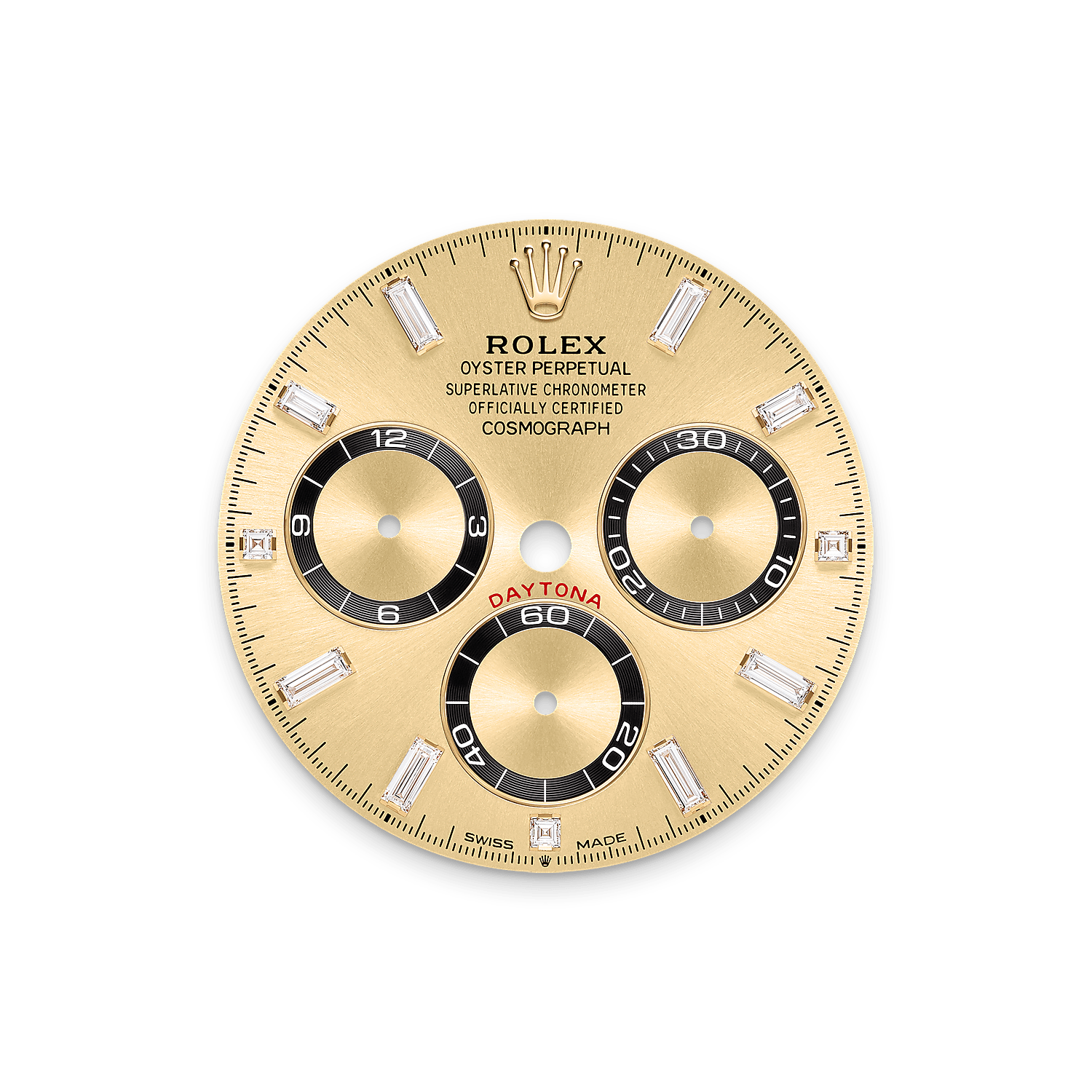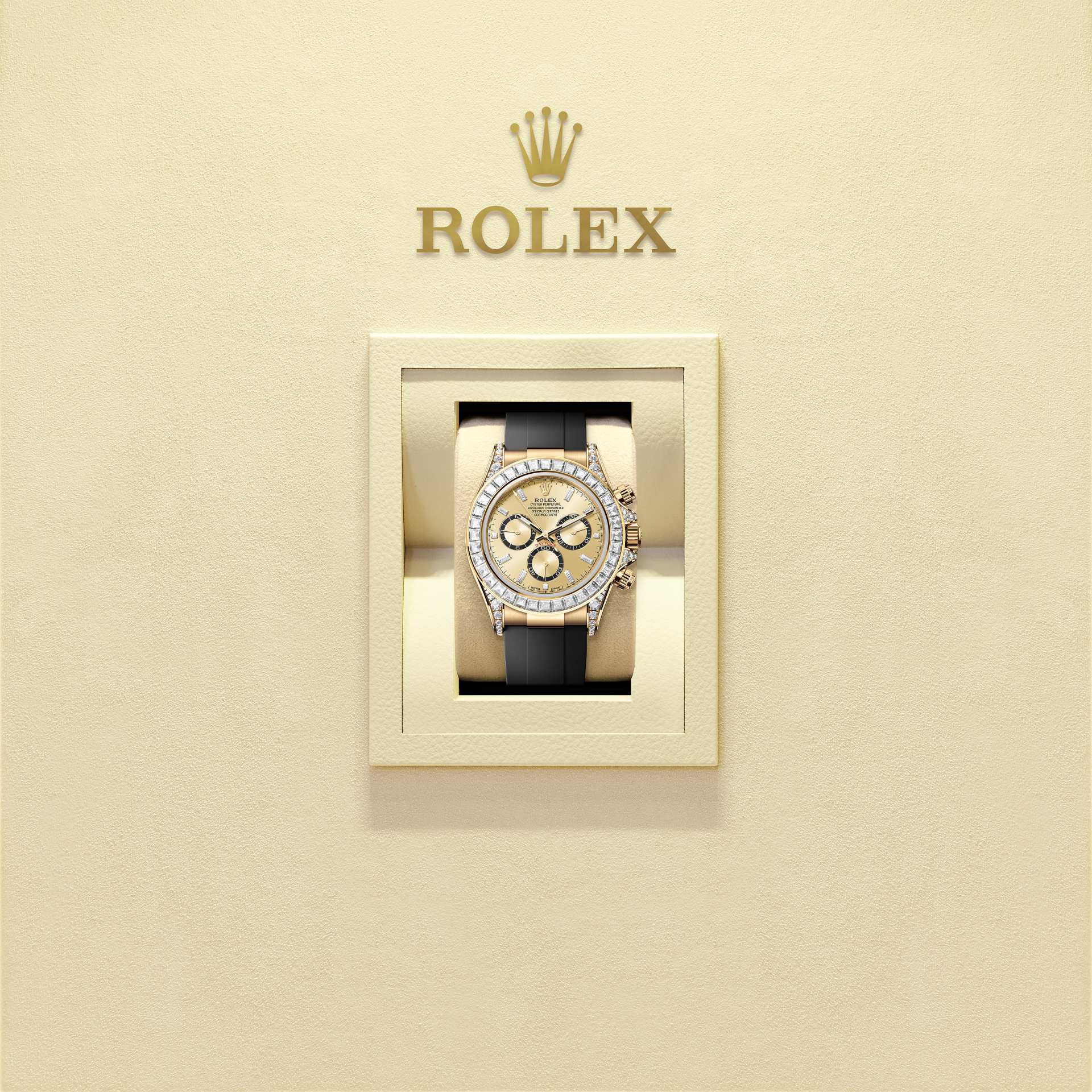 蚝式恒动宇宙计型迪通拿腕表18K黄金款,搭配镶钻金色表盘和色彩对比鲜明的计时盘、Oysterflex表带、镶钻外圈及镶钻表耳。