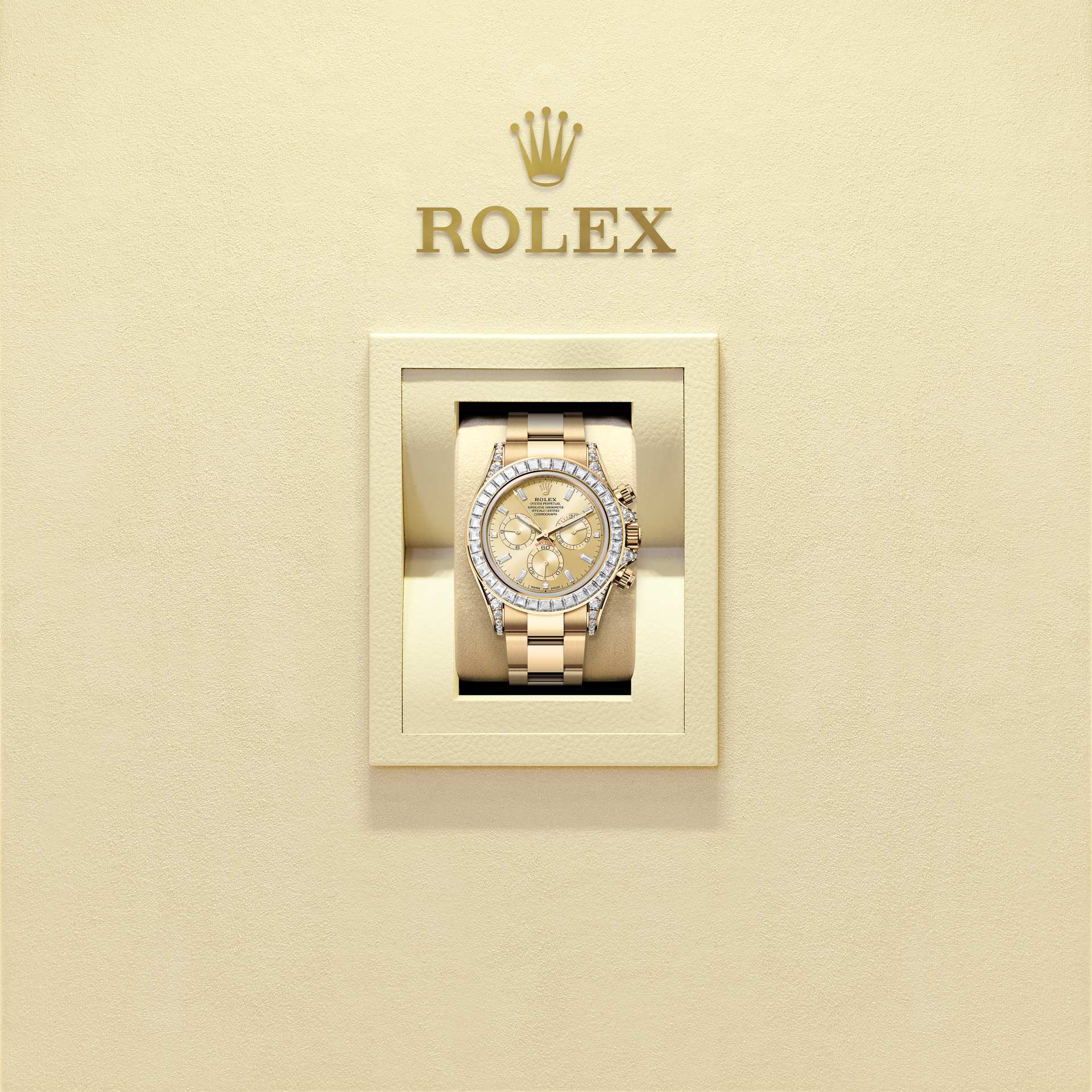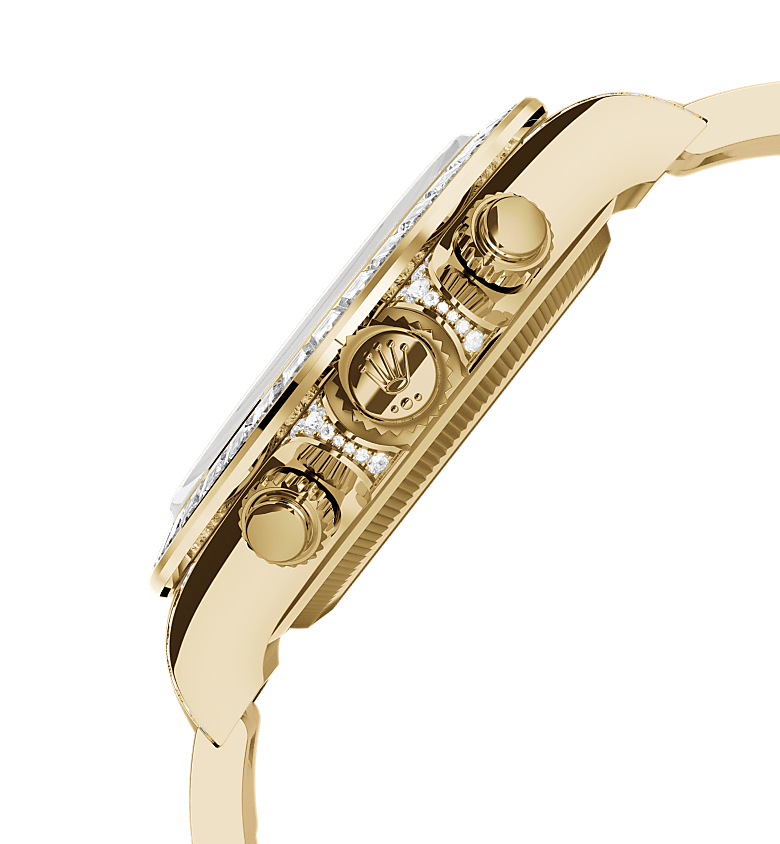 蚝式恒动宇宙计型迪通拿腕表18K黄金款,搭配镶钻金色表盘、蚝式(Oyster)表带、镶钻外圈及镶钻表耳。