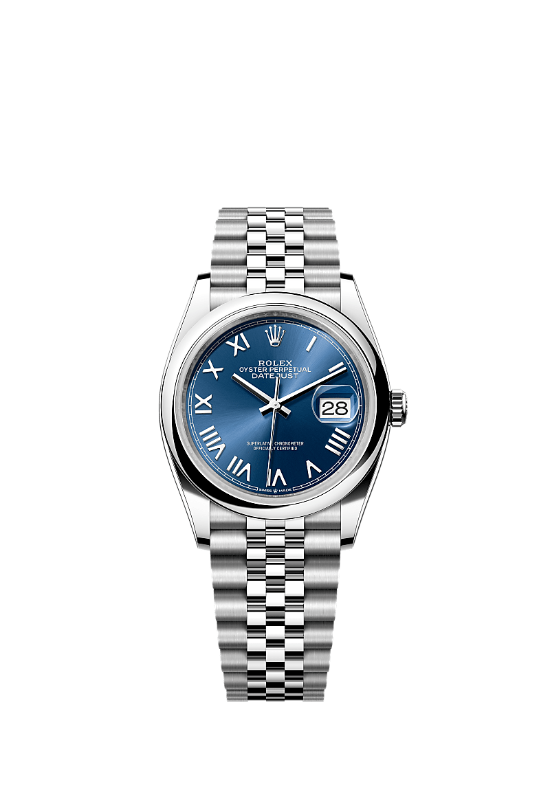 蚝式恒动日志型 36腕表蚝式钢款,搭配亮蓝色表盘及纪念型(Jubilee)表带。