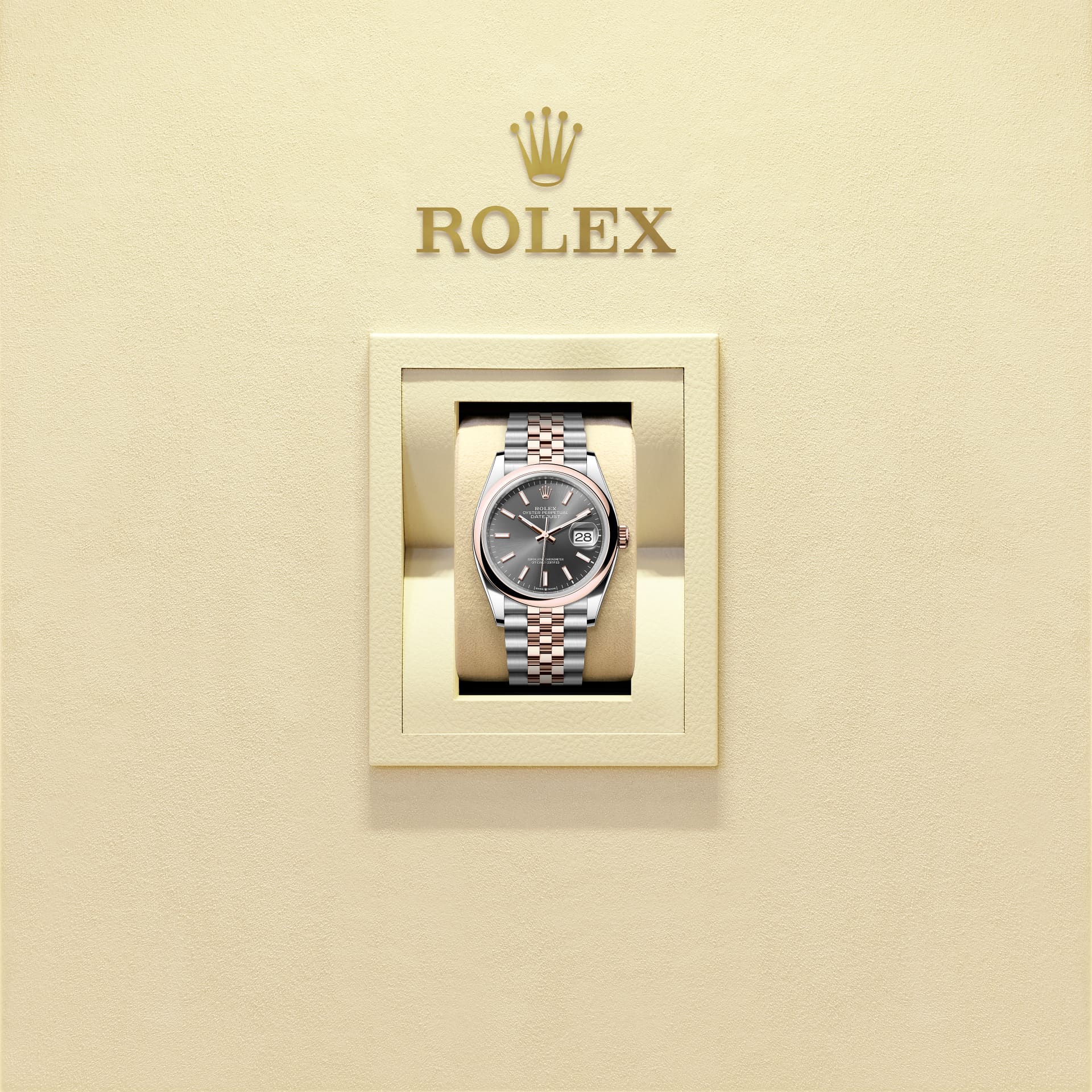 蚝式恒动日志型 36腕表永恒玫瑰金及蚝式钢款,搭配石板灰色表盘及纪念型(Jubilee)表带。