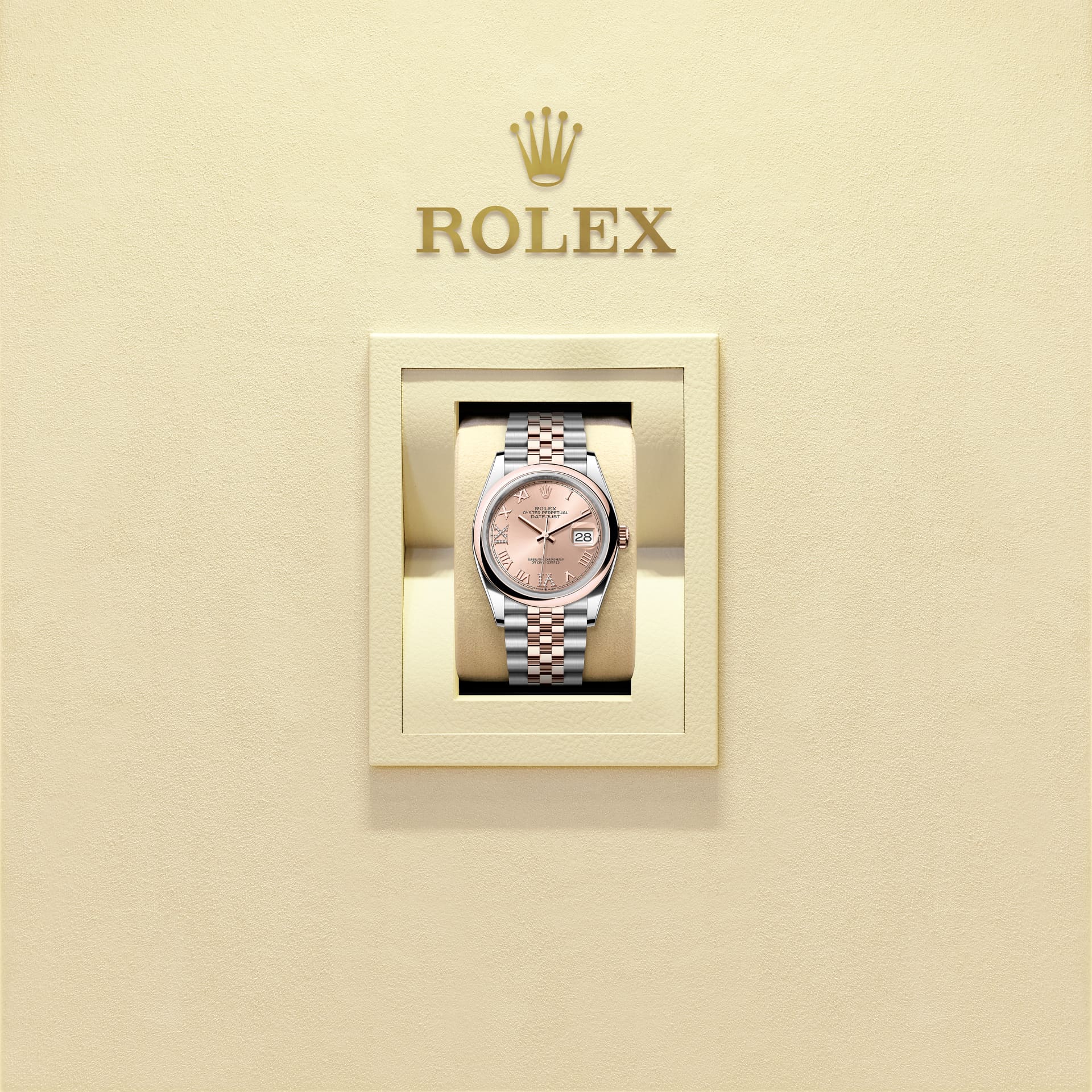 蚝式恒动日志型 36腕表永恒玫瑰金及蚝式钢款,搭配镶钻玫瑰金色表盘及纪念型(Jubilee)表带。