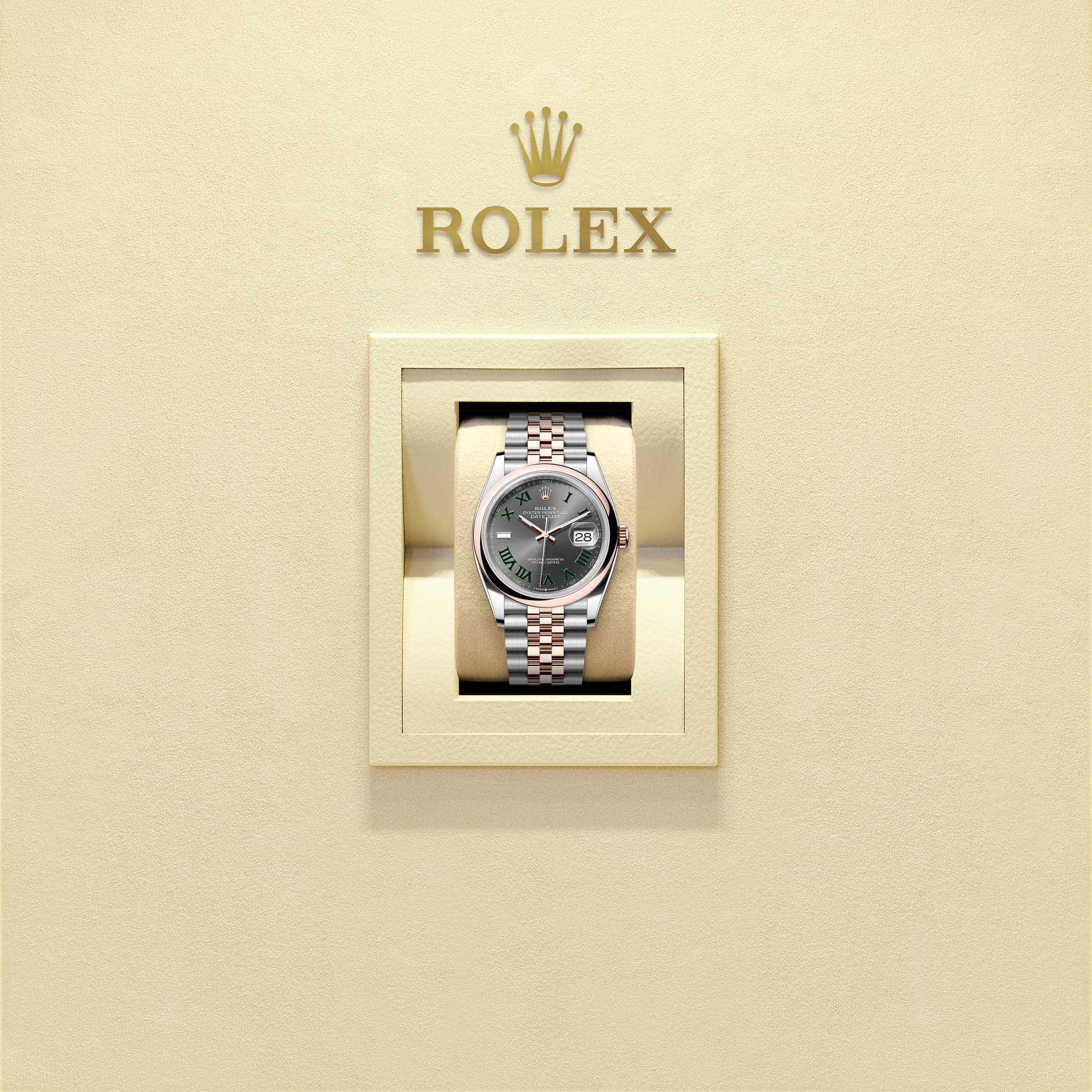 蚝式恒动日志型 36腕表永恒玫瑰金及蚝式钢款,搭配石板灰色表盘及纪念型(Jubilee)表带。