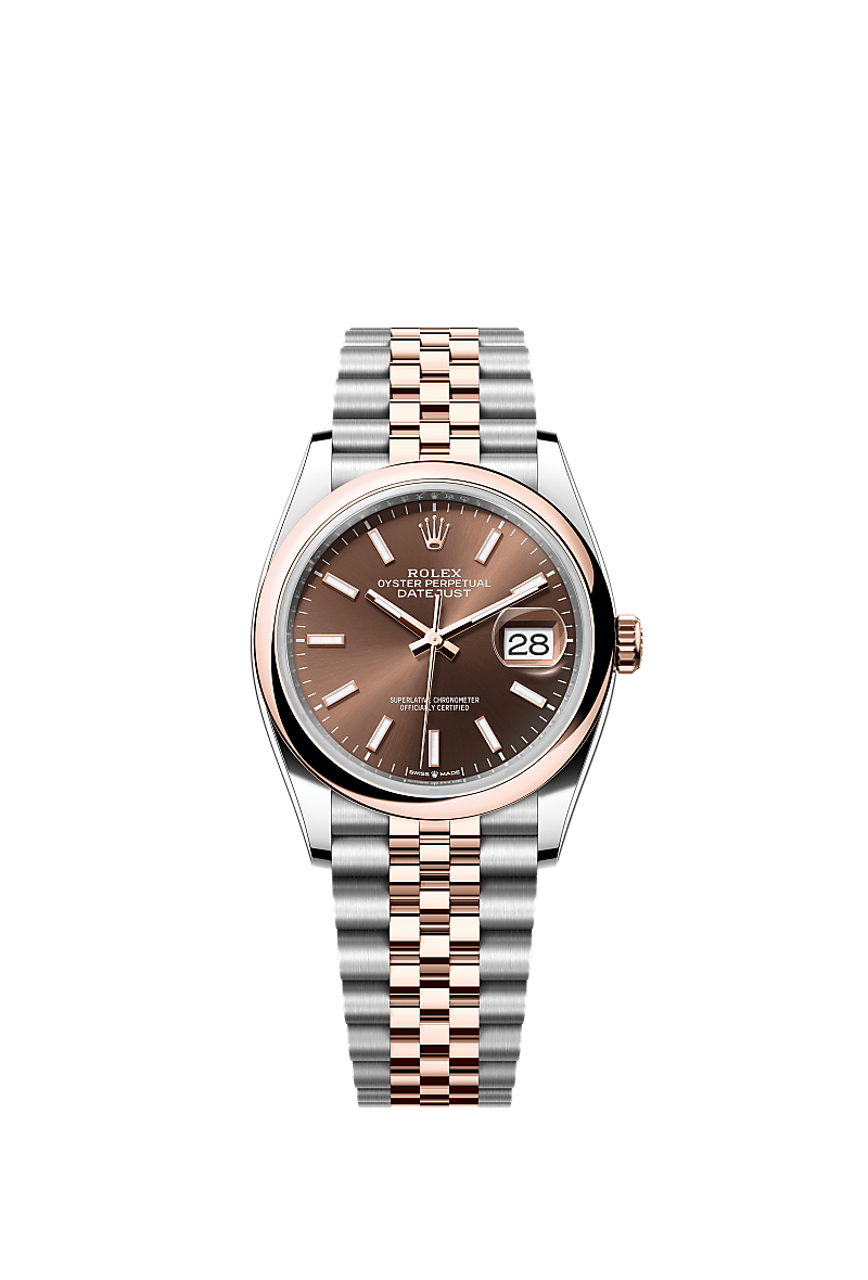 蚝式恒动日志型 36腕表永恒玫瑰金及蚝式钢款,搭配巧克力色表盘及纪念型(Jubilee)表带。