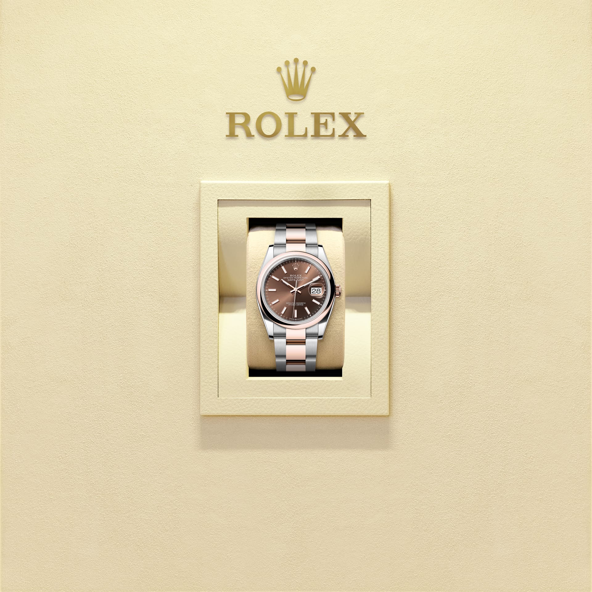 蚝式恒动日志型 36腕表永恒玫瑰金及蚝式钢款,搭配巧克力色表盘及蚝式(Oyster)表带。