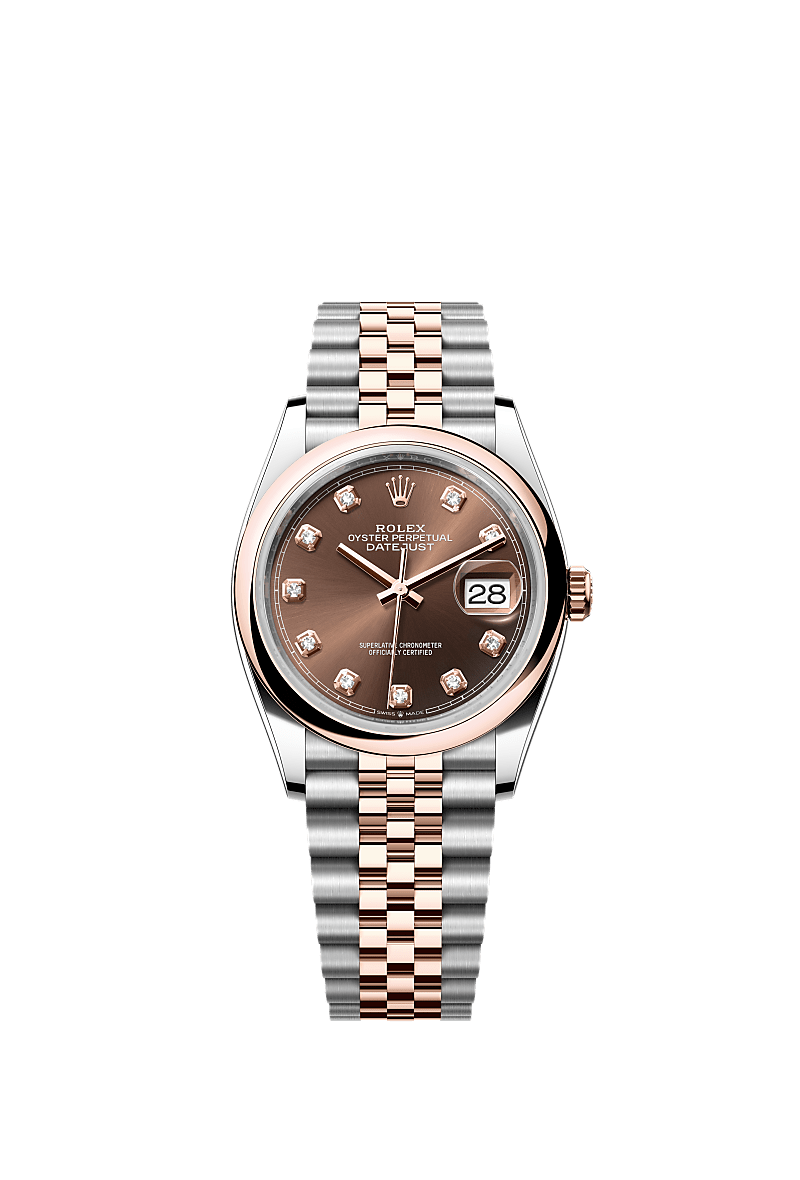 蚝式恒动日志型 36腕表永恒玫瑰金及蚝式钢款,搭配镶钻巧克力色表盘及纪念型(Jubilee)表带。