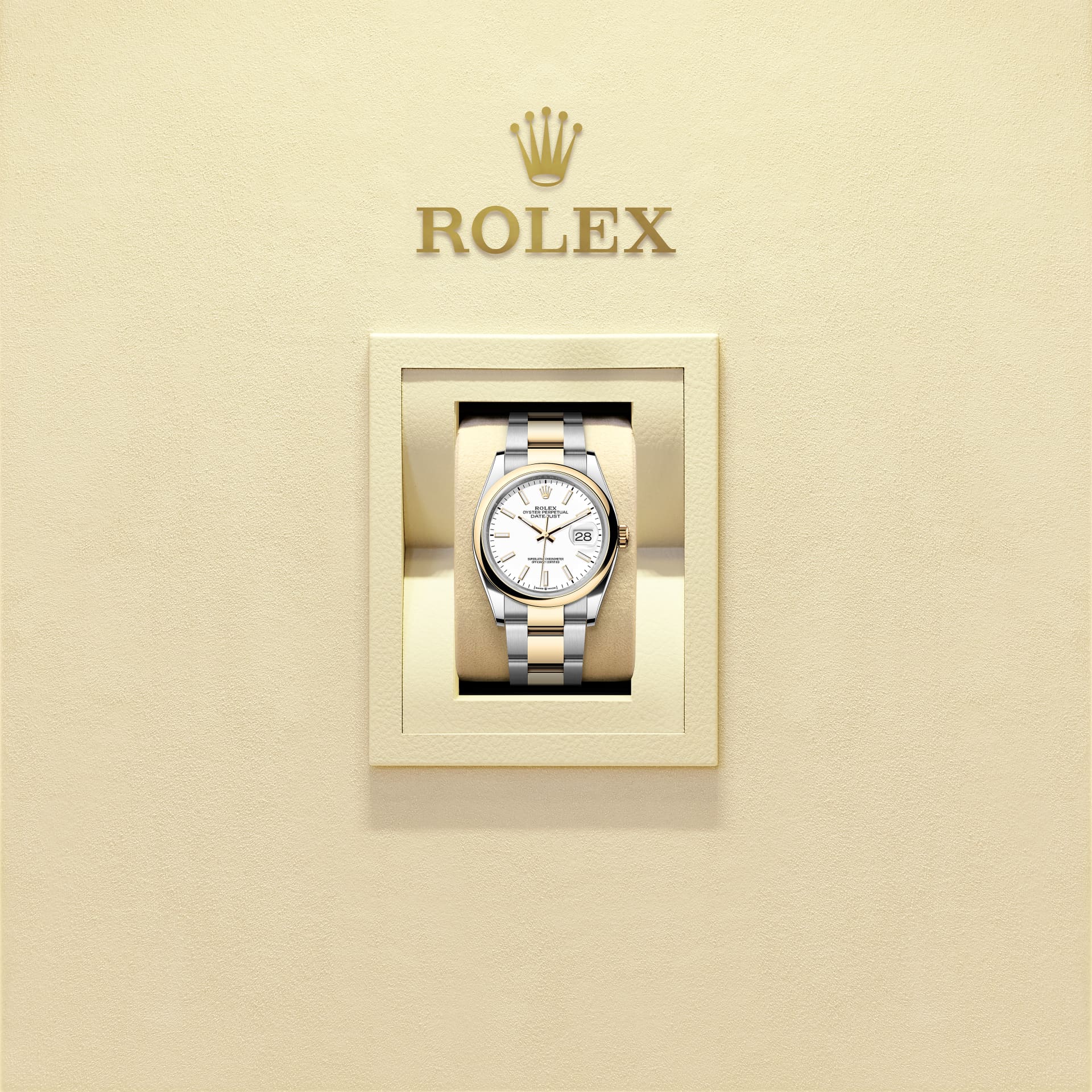 蚝式恒动日志型 36腕表黄金及蚝式钢款,搭配白色表盘及蚝式(Oyster)表带。