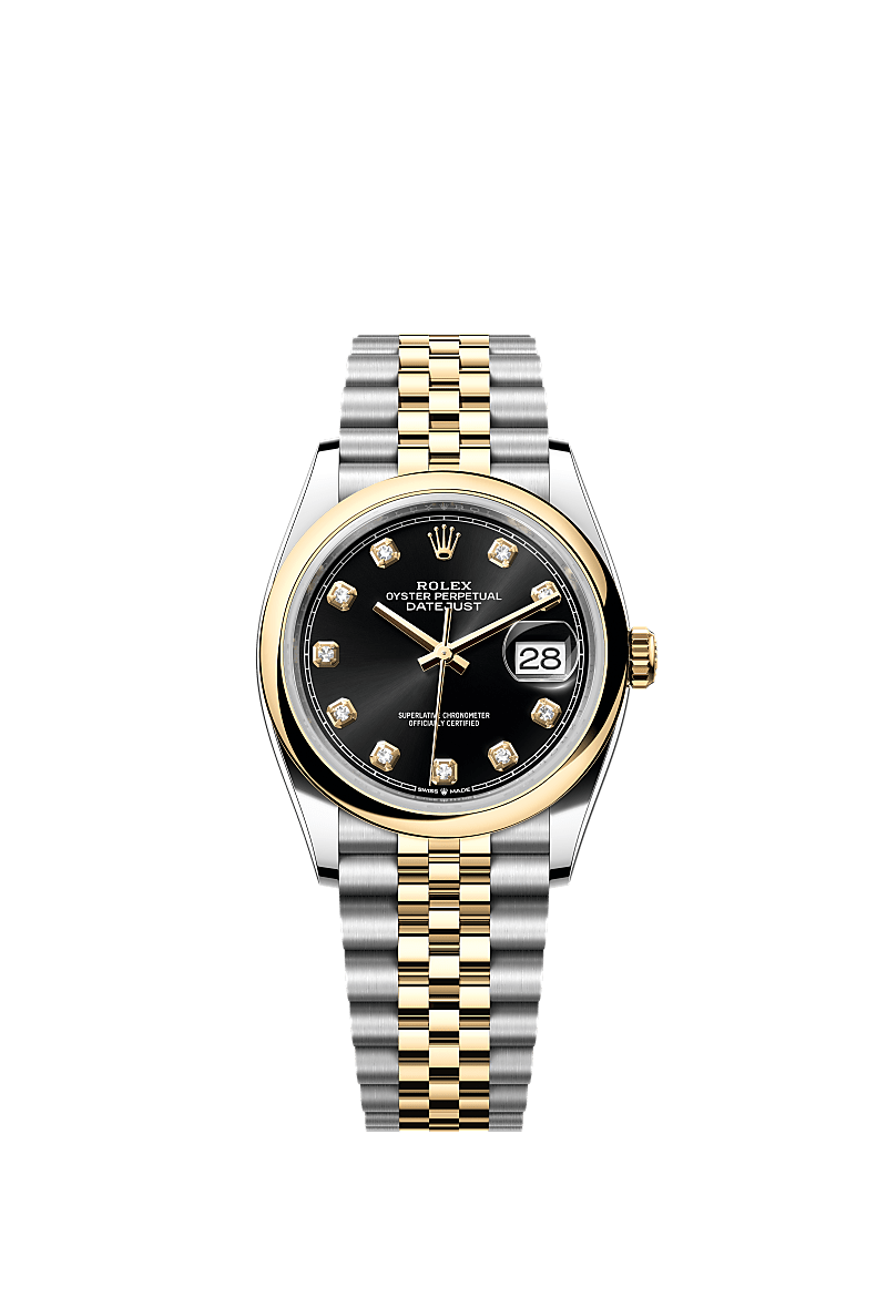 蚝式恒动日志型 36腕表黄金及蚝式钢款,搭配镶钻亮黑色表盘及纪念型(Jubilee)表带。
