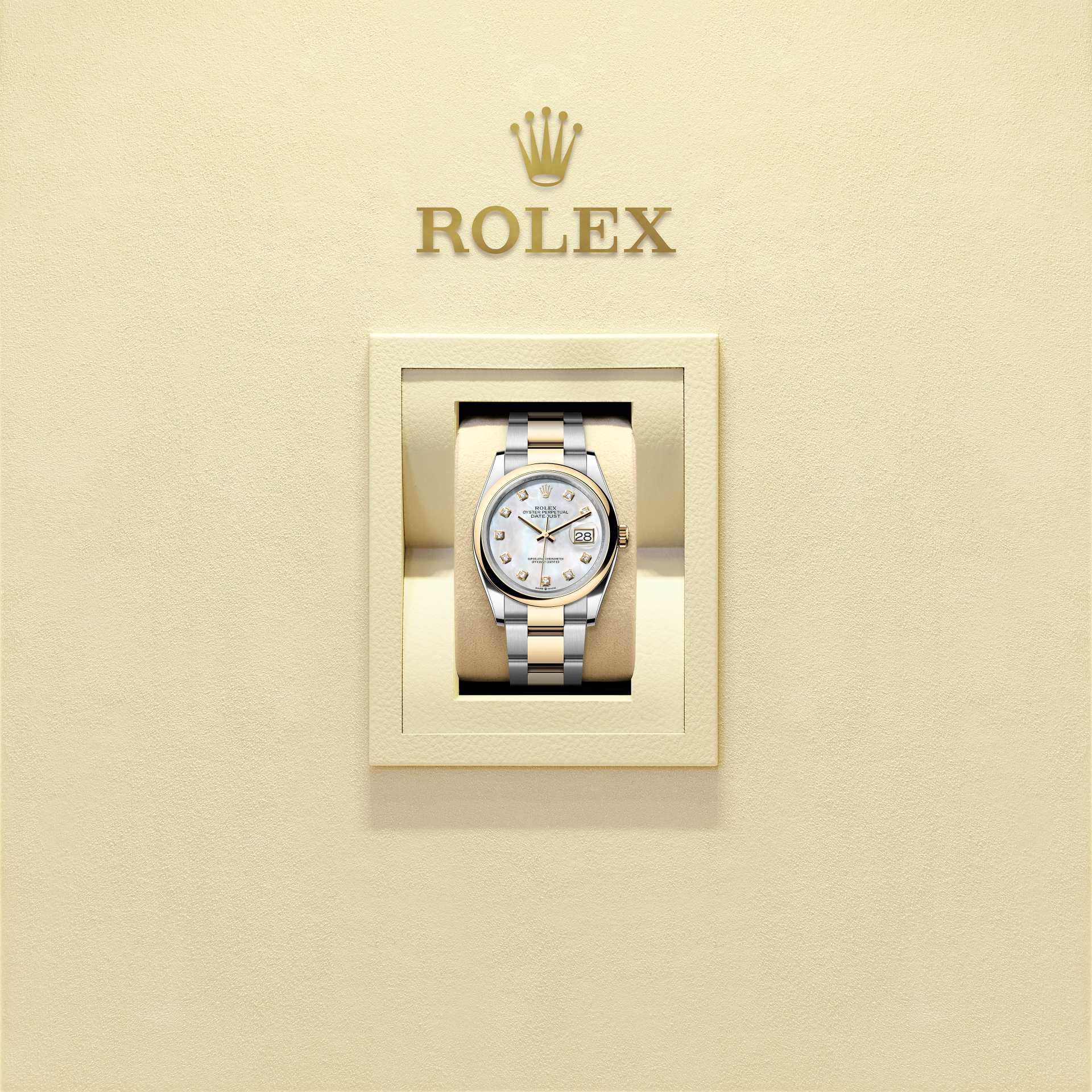 蚝式恒动日志型 36腕表黄金及蚝式钢款,搭配镶钻白色珍珠母表盘及蚝式(Oyster)表带。