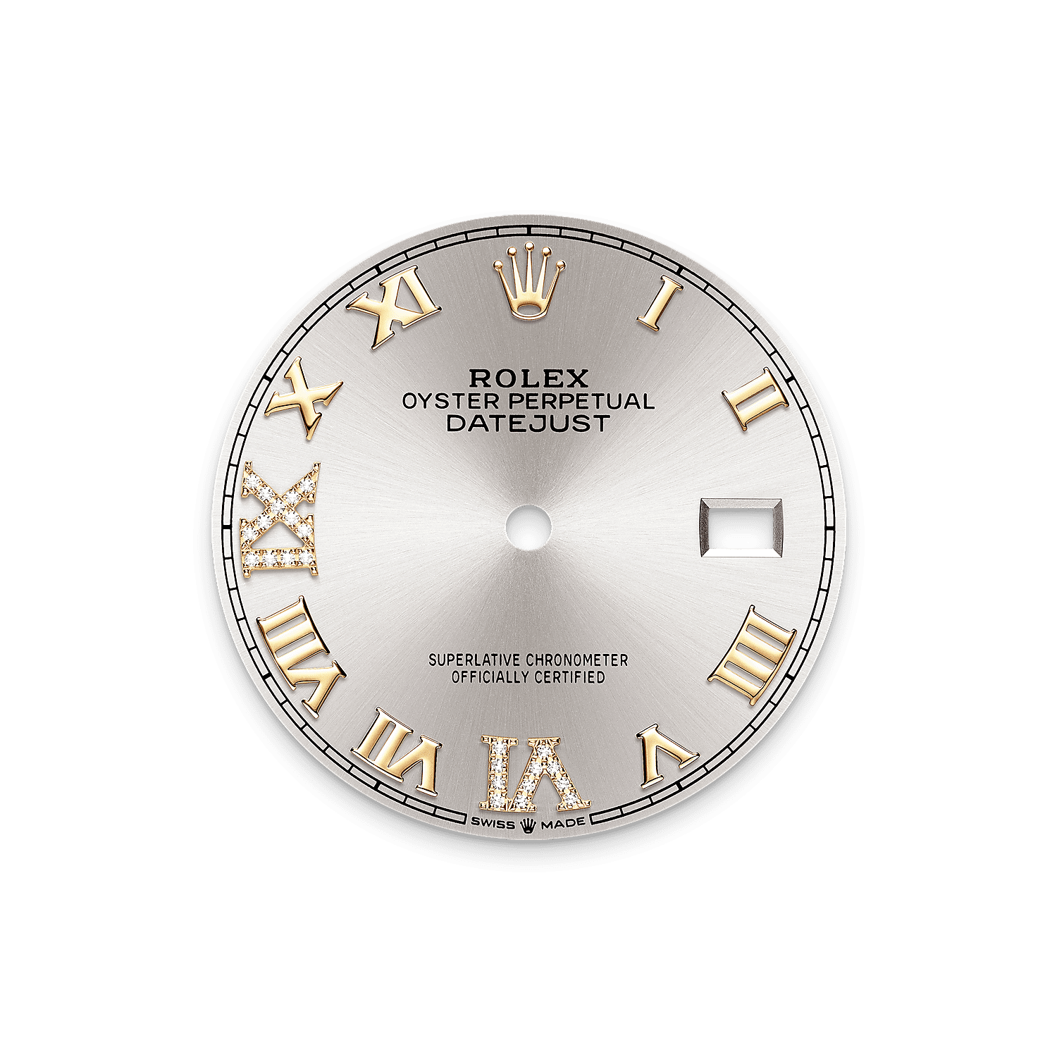 表盘设有镶24颗钻石的18K金罗马数字VI和IX。蚝式系列的许多表盘款式均采用太阳光线效果,折射出淡雅光泽。这种效果需要超卓的刷光技术,打造从表盘中央往外扩展的刻纹。