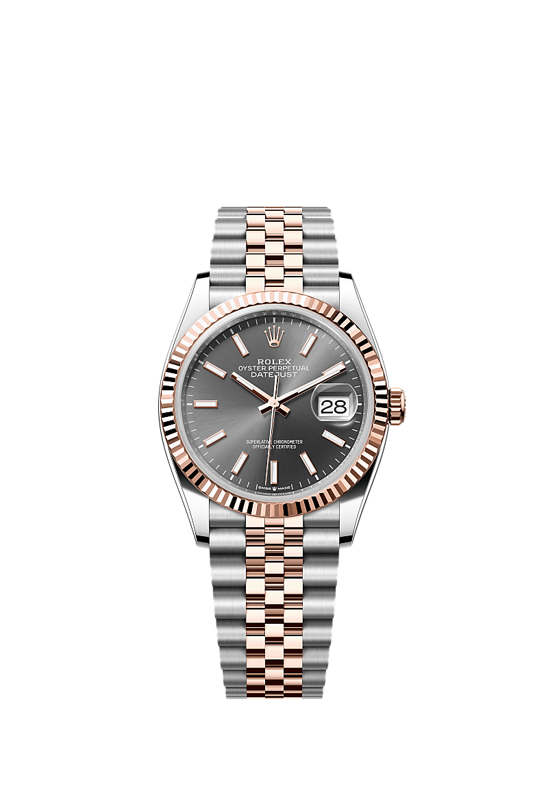 蚝式恒动日志型 36腕表永恒玫瑰金及蚝式钢款,搭配石板灰色表盘及纪念型(Jubilee)表带。