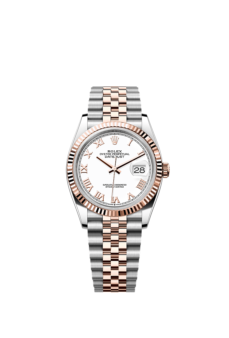 蚝式恒动日志型 36腕表永恒玫瑰金及蚝式钢款,搭配白色表盘及纪念型(Jubilee)表带。