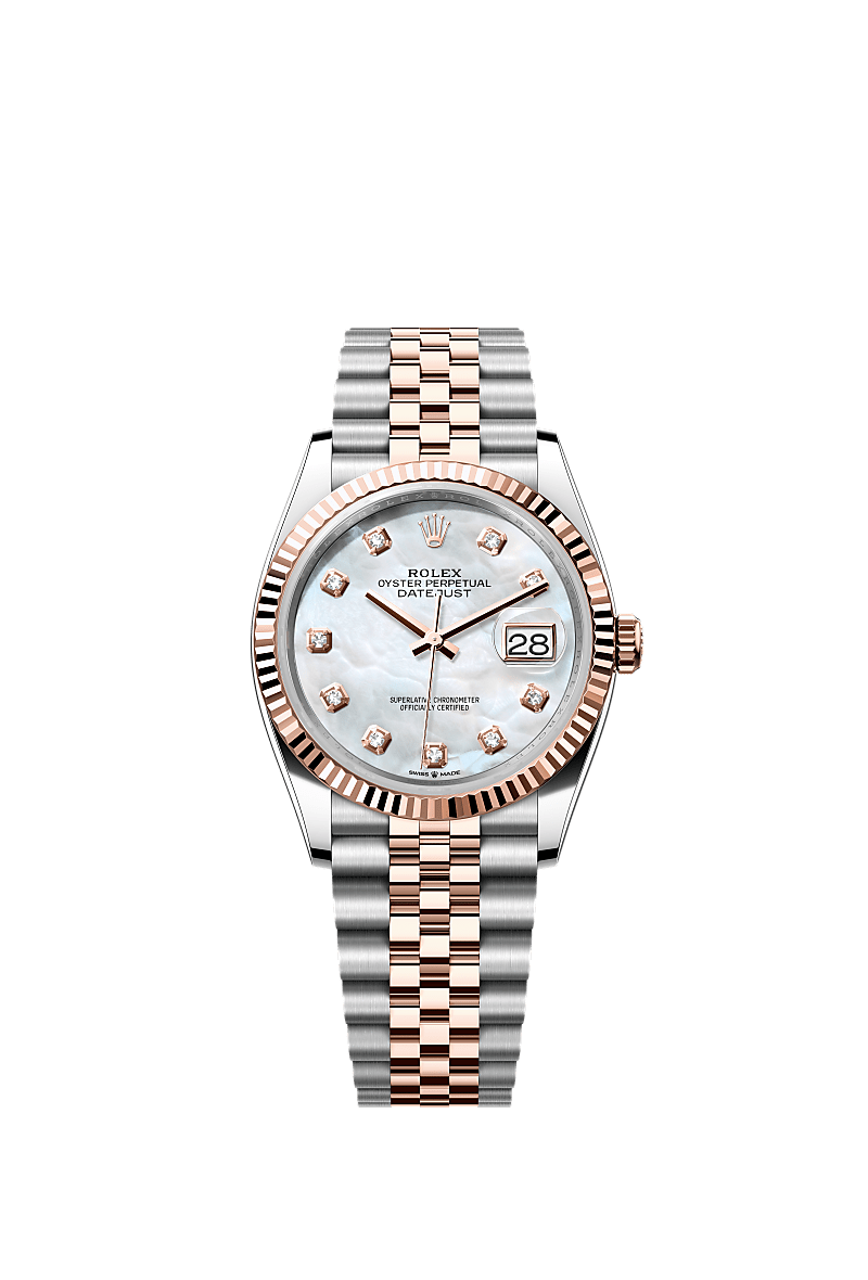 蚝式恒动日志型 36腕表永恒玫瑰金及蚝式钢款,搭配镶钻白色珍珠母表盘及纪念型(Jubilee)表带。