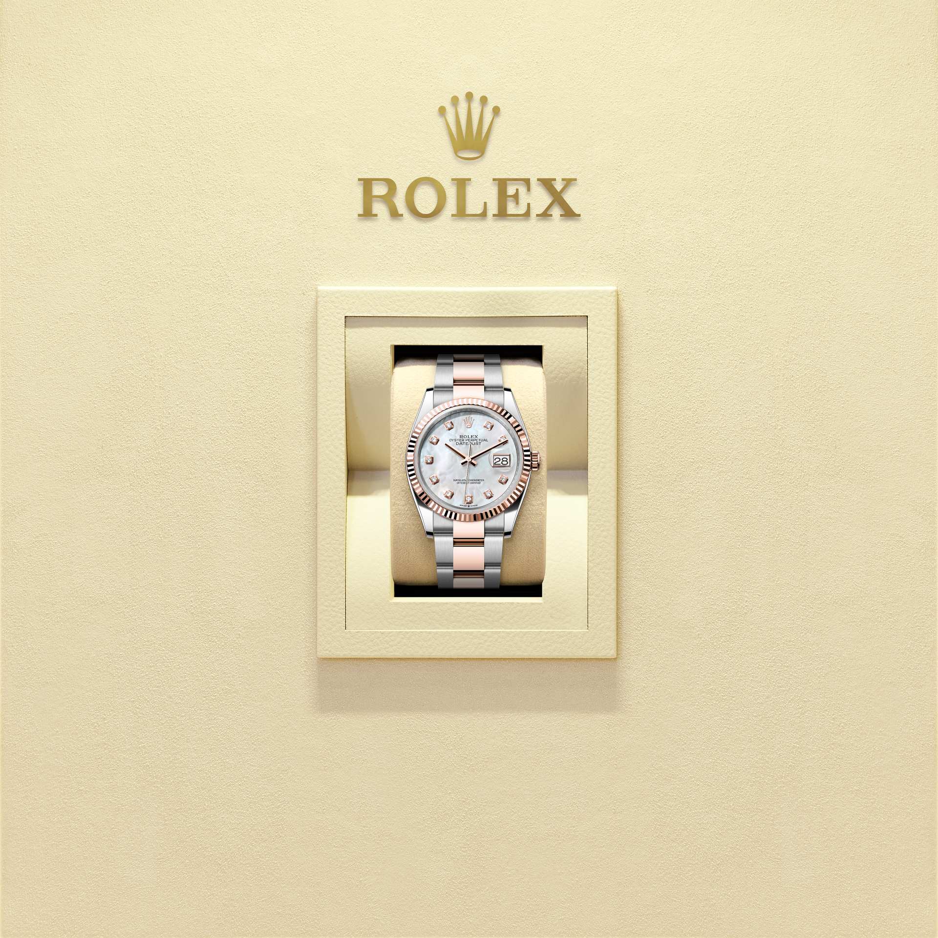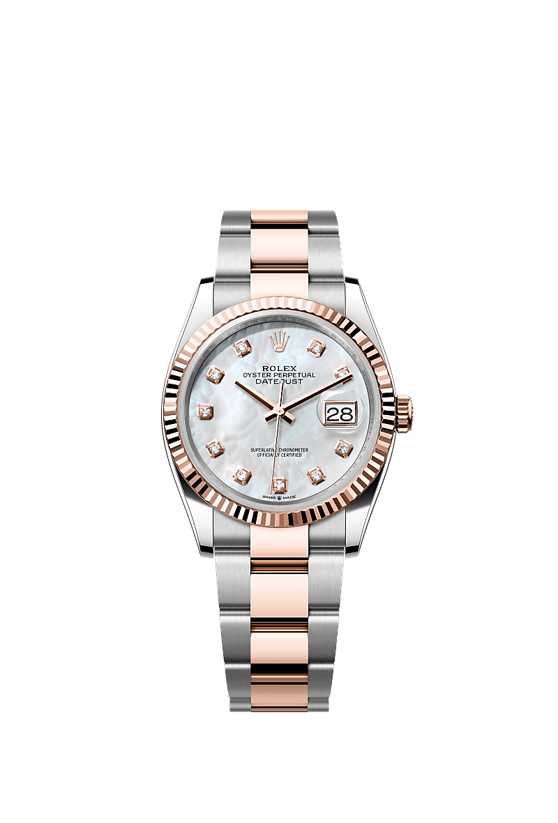 蚝式恒动日志型 36腕表永恒玫瑰金及蚝式钢款,搭配镶钻白色珍珠母表盘及蚝式(Oyster)表带。