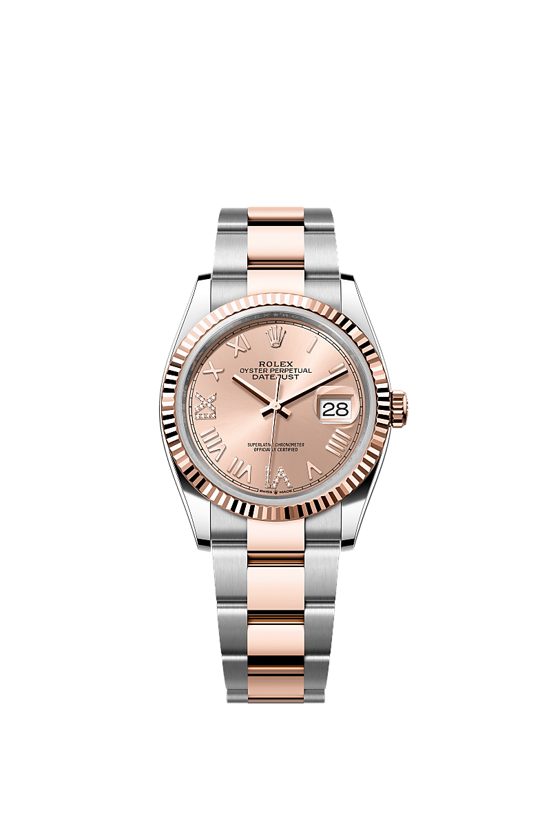 蚝式恒动日志型 36腕表永恒玫瑰金及蚝式钢款,搭配镶钻玫瑰金色表盘及蚝式(Oyster)表带。