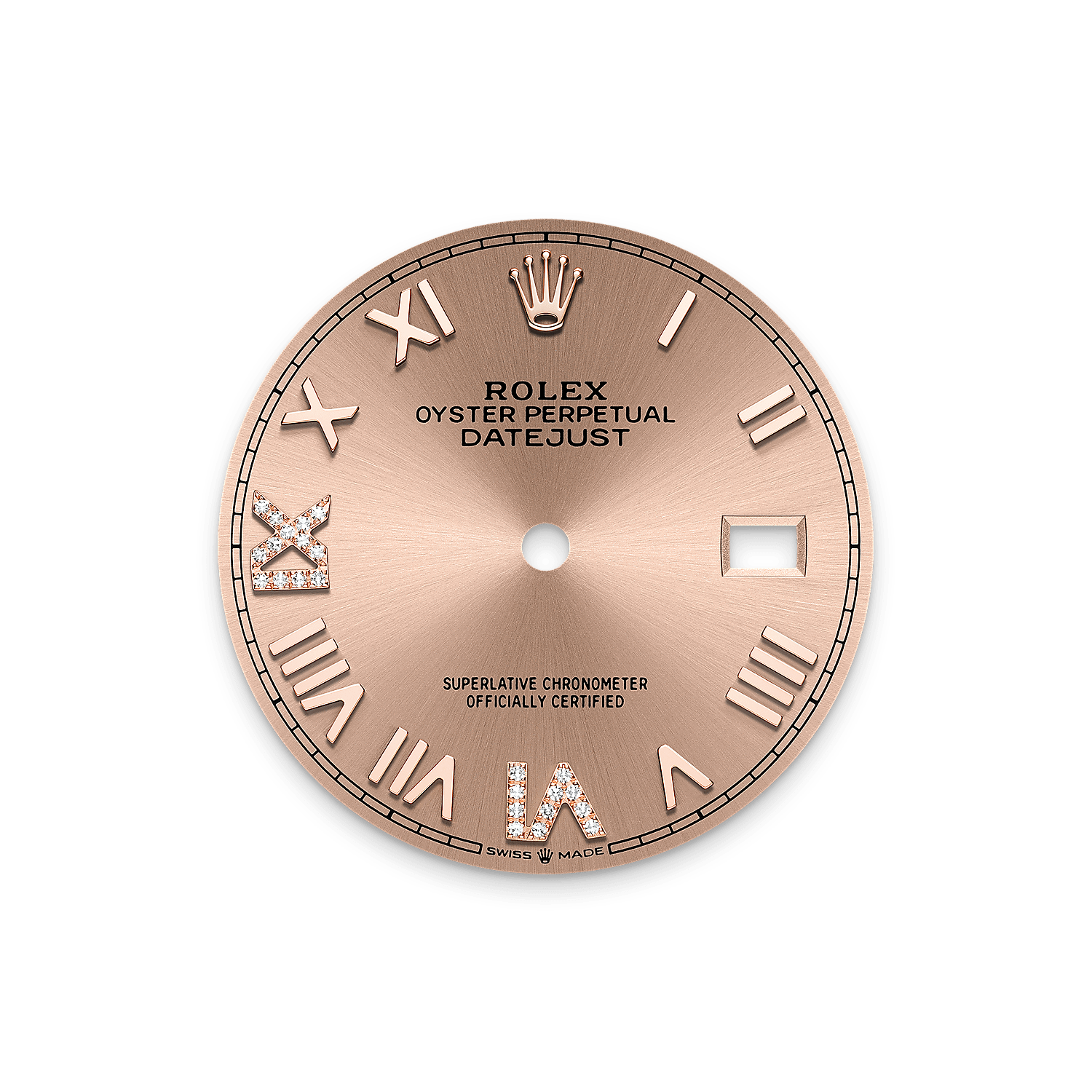 表盘设有镶24颗钻石的18K金罗马数字VI和IX。蚝式恒动系列的许多表盘款式均采用太阳光线效果,折射出淡雅光泽。这种效果需要超卓的刷光技术,打造从表盘中央往外扩展的刻纹。