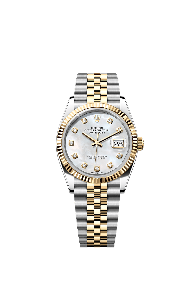 蚝式恒动日志型 36腕表黄金及蚝式钢款,搭配镶钻白色珍珠母表盘及纪念型(Jubilee)表带。