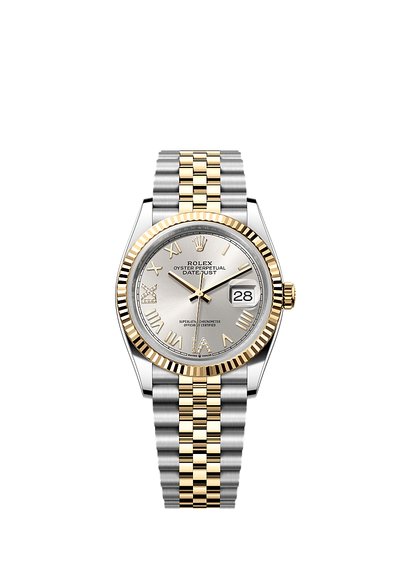 蚝式恒动日志型 36腕表黄金及蚝式钢款,搭配镶钻银色表盘及纪念型(Jubilee)表带。