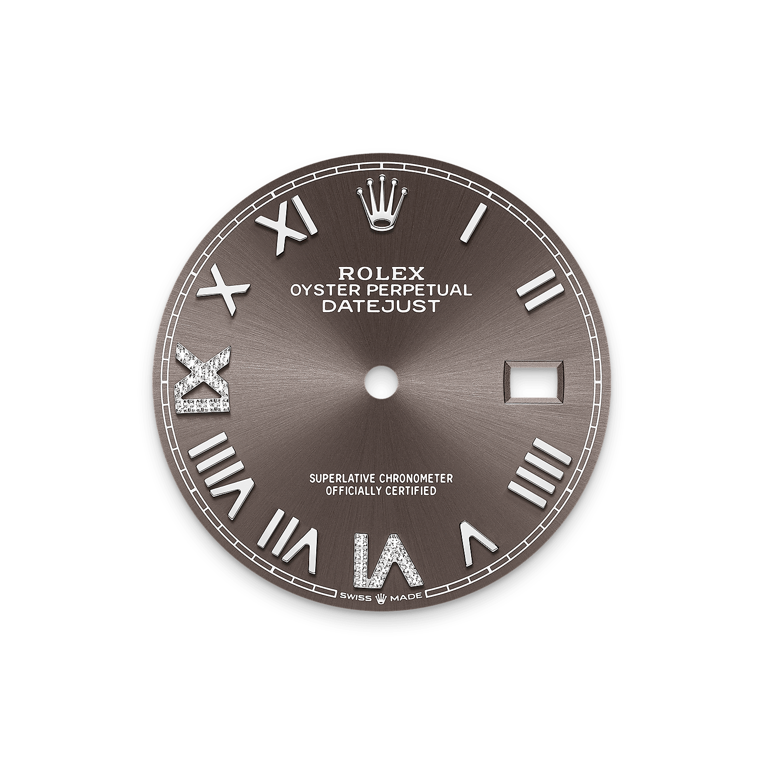 表盘设有镶24颗钻石的18K金罗马数字VI和IX。蚝式系列的许多表盘款式均采用太阳光线效果,折射出淡雅光泽。这种效果需要超卓的刷光技术,打造从表盘中央往外扩展的刻纹。