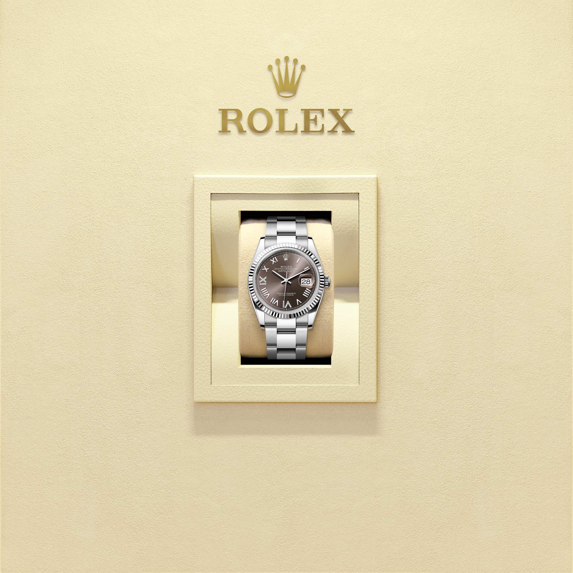 表盘设有镶24颗钻石的18K金罗马数字VI和IX。蚝式系列的许多表盘款式均采用太阳光线效果,折射出淡雅光泽。这种效果需要超卓的刷光技术,打造从表盘中央往外扩展的刻纹。