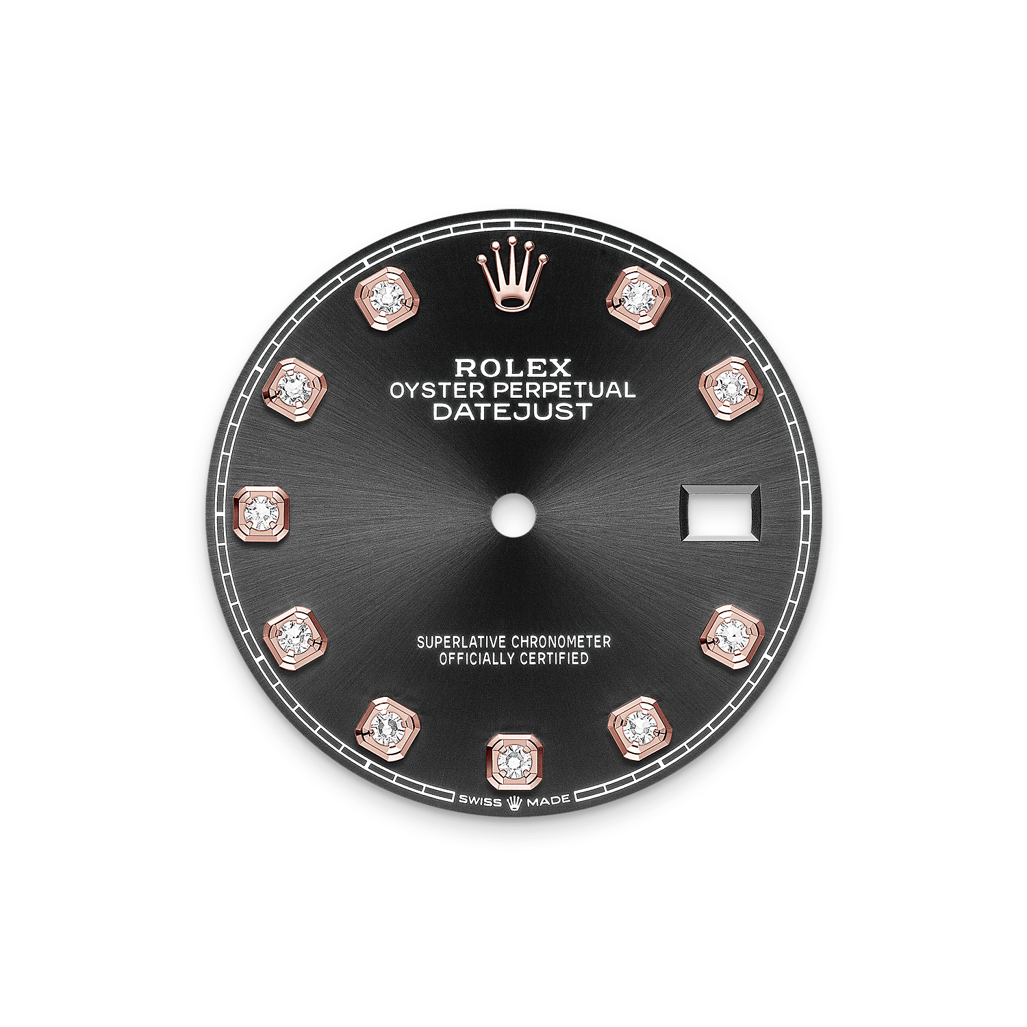 蚝式恒动日志型 36腕表永恒玫瑰金及蚝式钢款,搭配镶钻亮黑色表盘及蚝式(Oyster)表带。