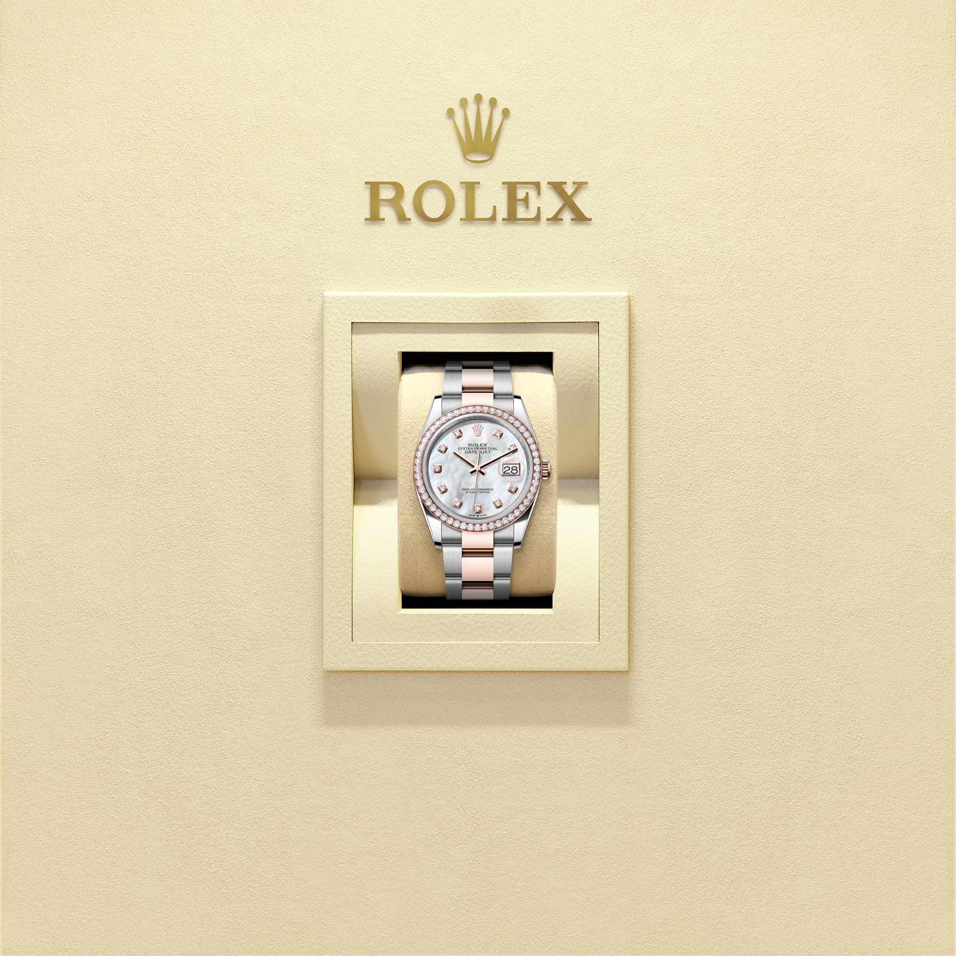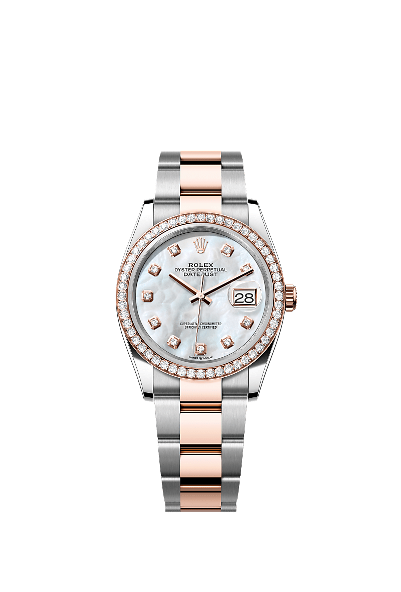 蚝式恒动日志型 36腕表永恒玫瑰金及蚝式钢款,搭配镶钻白色珍珠母表盘及蚝式(Oyster)表带。