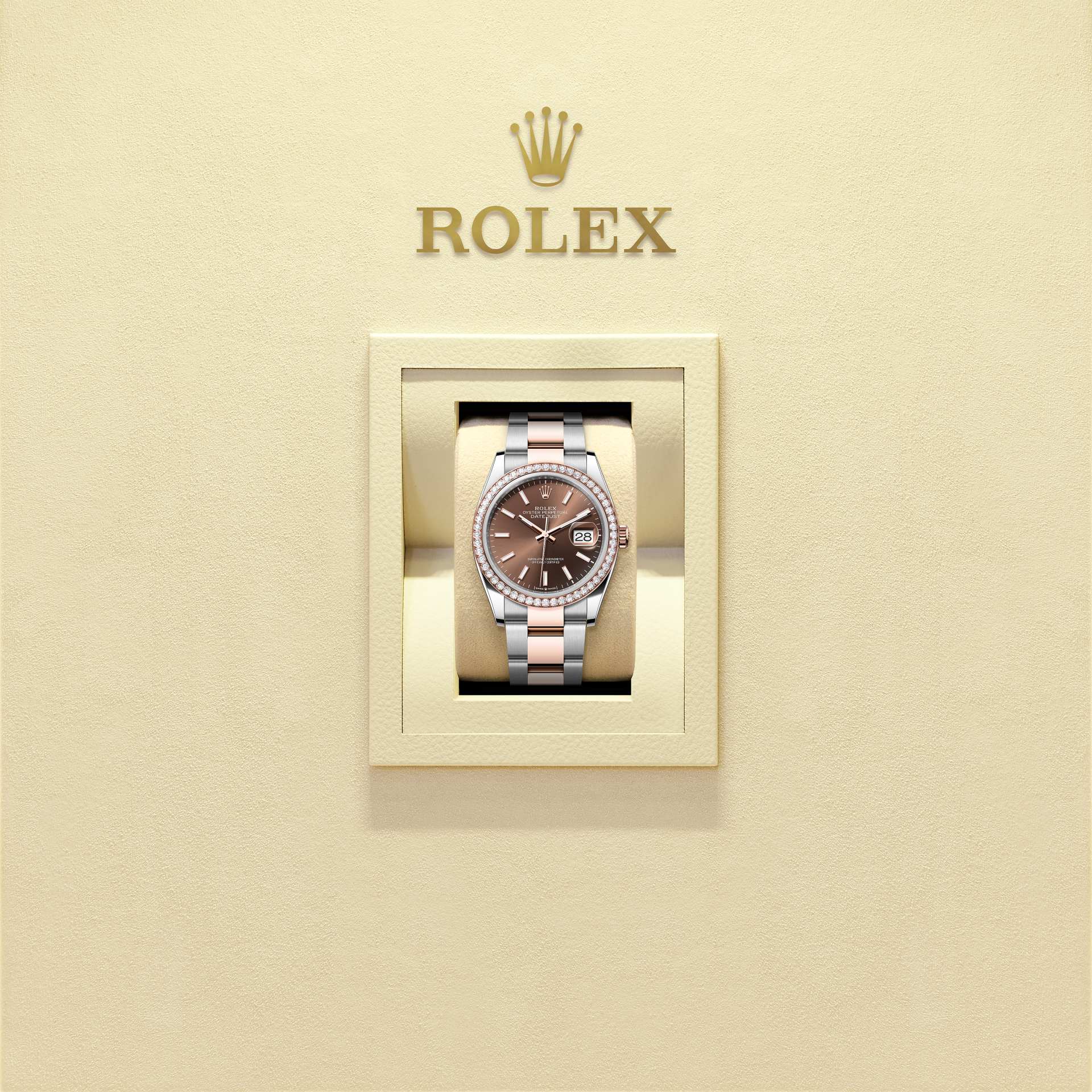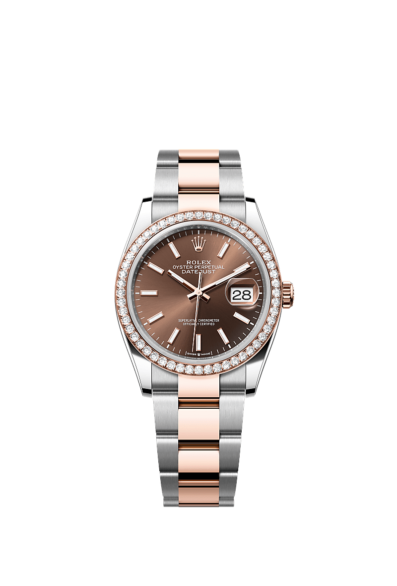 蚝式恒动日志型 36腕表永恒玫瑰金及蚝式钢款,搭配巧克力色表盘及蚝式(Oyster)表带。