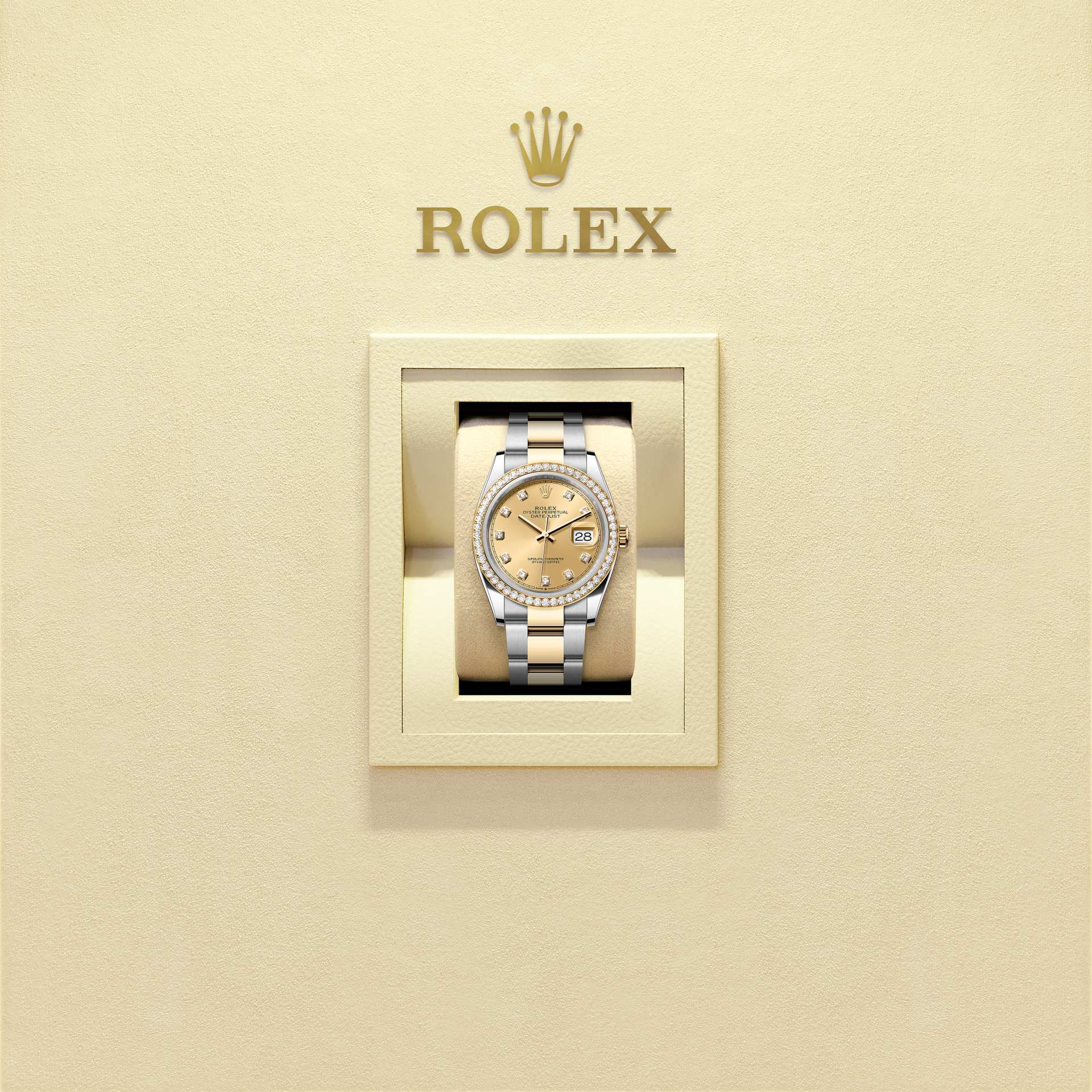 蚝式恒动日志型 36腕表黄金及蚝式钢款,搭配镶钻香槟色表盘及蚝式(Oyster)表带。