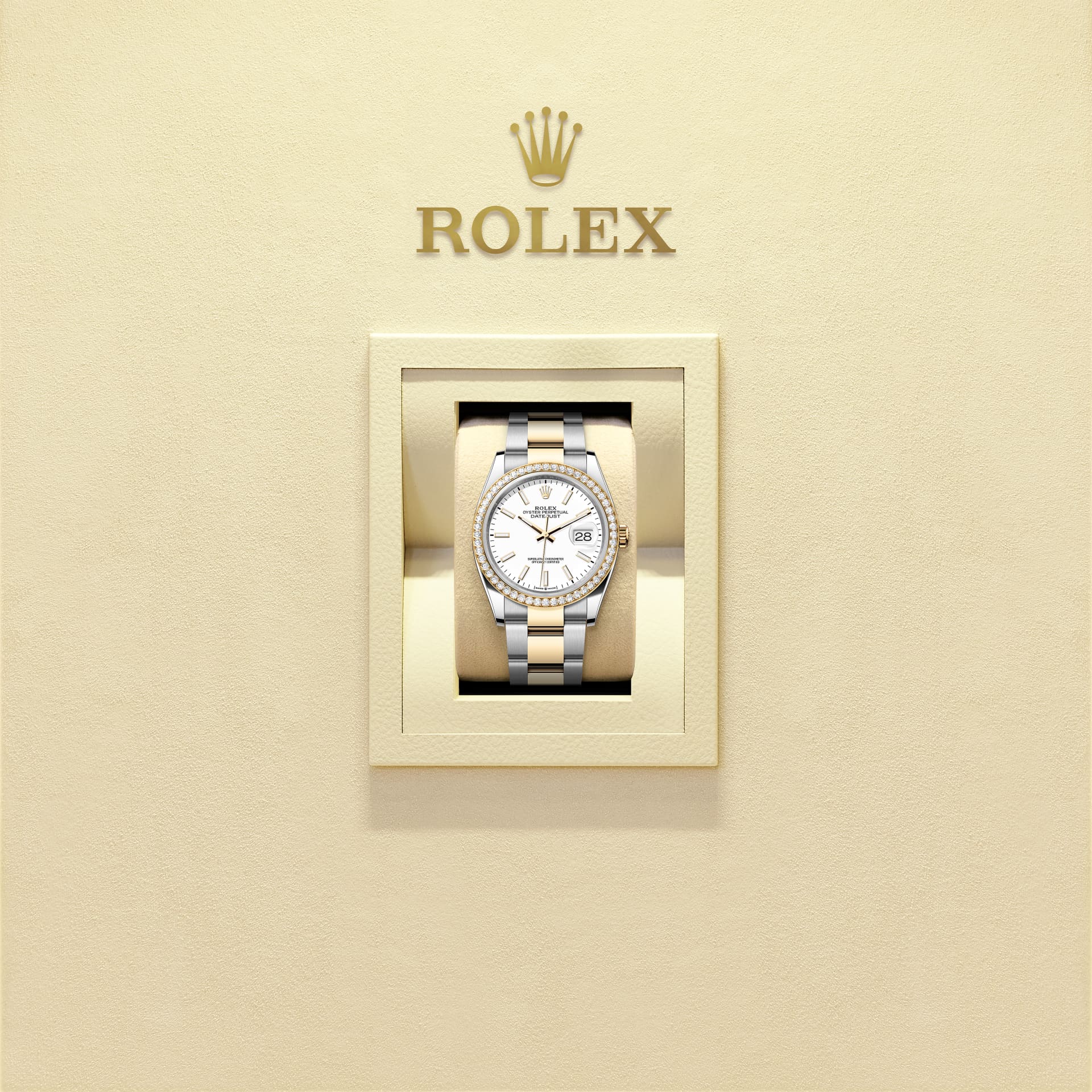 蚝式恒动日志型 36腕表黄金及蚝式钢款,搭配白色表盘及蚝式(Oyster)表带。