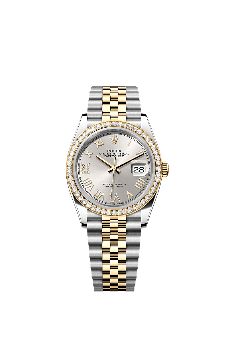 蚝式恒动日志型 36腕表黄金及蚝式钢款,搭配镶钻银色表盘及纪念型(Jubilee)表带。
